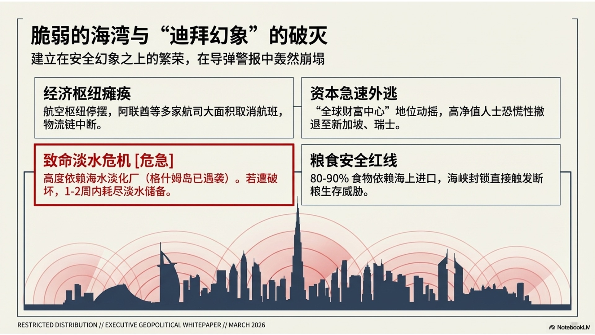 战争后果极其惨烈:霍尔木兹海峡被封锁,导致全球五分之一能源供应停摆,油价飙升至近120美元。这不仅戳破了迪拜的繁荣绿洲假象,更重创了日、韩及东大的能源安全。