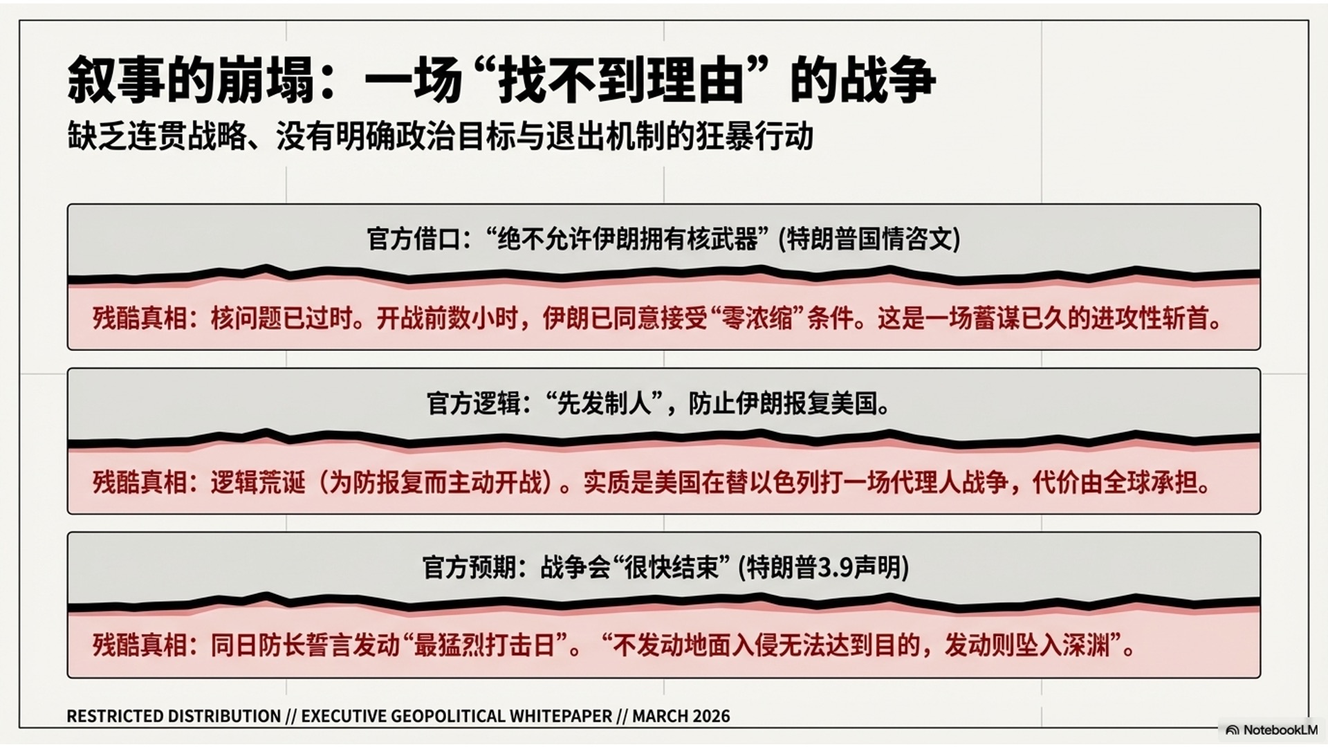 尽管美方以核问题为借口,但叙事逻辑自相矛盾且极其混乱,被质疑是替以色列进行的代理人战争。