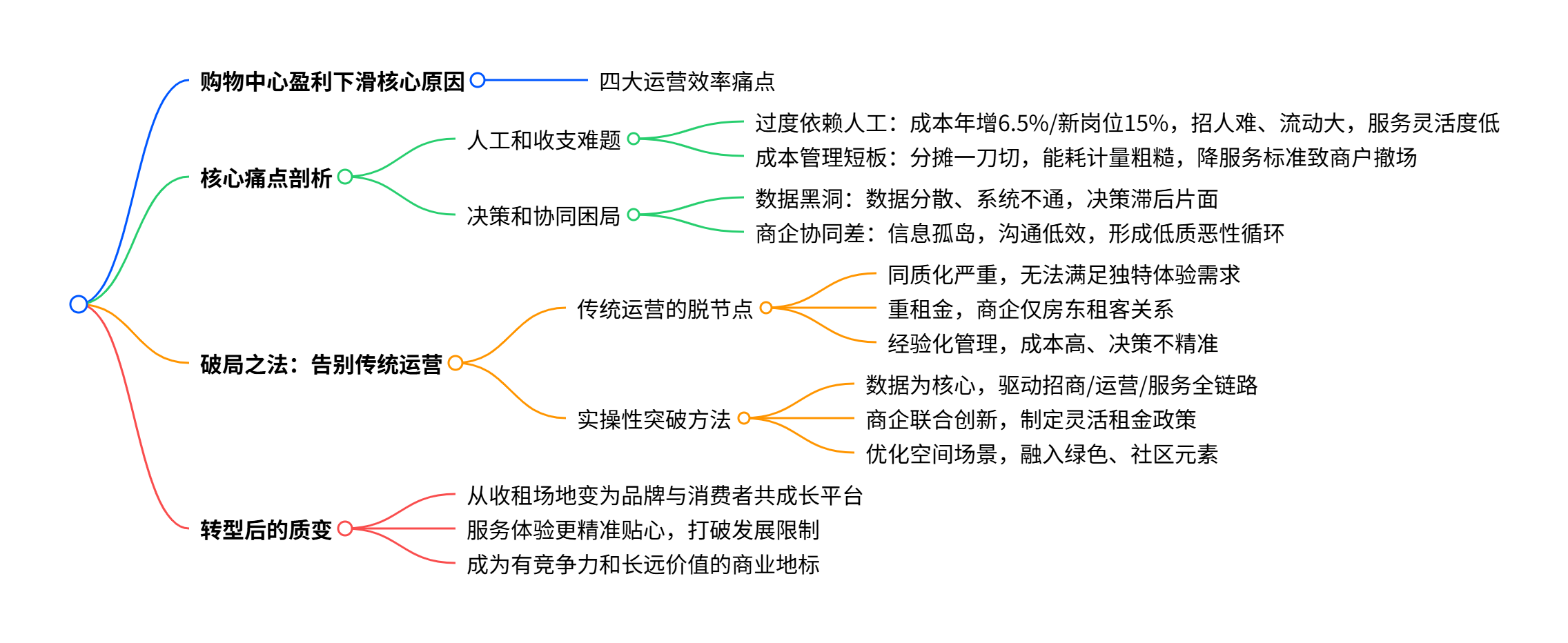 本期播客围绕购物中心盈利下滑的问题展开分析,指出核心症结在于"四大运营效率痛点",重点剖析了"人工和收支难题"、"决策和协同困局"两大核心问题,其中人工成本以"6.5%" 年增速增长、新岗位达"15%",还存在成本分摊粗糙、数据孤岛、部门壁垒、商企各自为政等问题;并提出破局关键是告别传统粗放式运营,通过"数据驱动全链路运营"、打通信息孤岛、打造商企共赢生态、优化空间场景等数字化转型方式,实现运营模式升级,让购物中心从单纯收租场地转变为品牌与消费者共同成长的平台,从而提升竞争力和抗风险能力,迎来盈利新曙光。