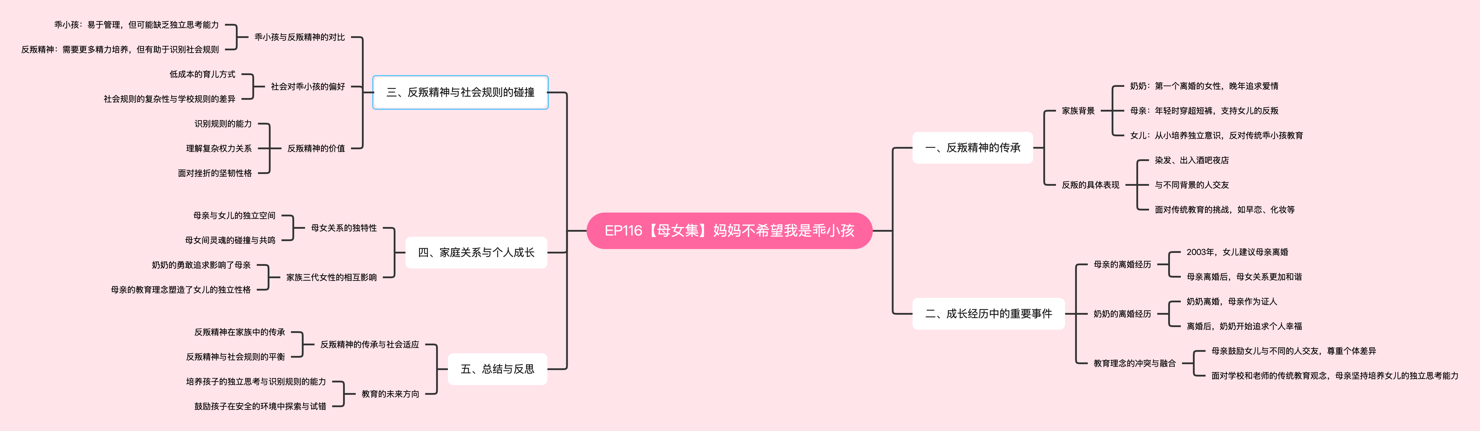 本期节目核心围绕“乖小孩”这一概念展开,通过母女两代人(并追溯至外祖母/奶奶一代)的成长经历,探讨了家庭教育、反叛精神、父权社会对女性的压抑以及三代女性如何传承“反叛基因”以掌握自己命运的故事。