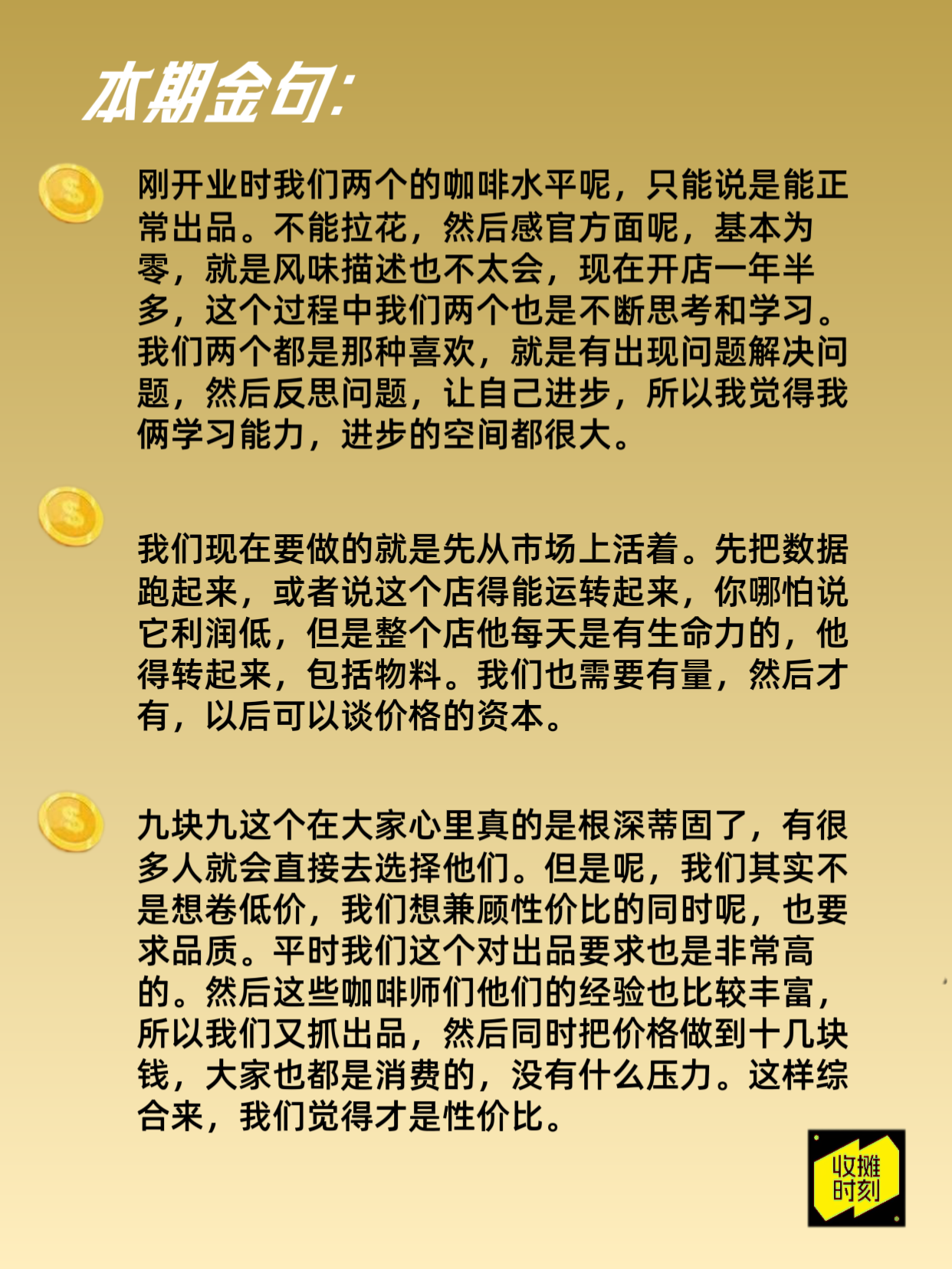 本期《收摊时刻》邀请到在河北保定创立咖啡品牌“kokososo coffee”(黄房子咖啡)的夫妻档创始人——贾哈哈与小黑。两人从音乐老师和程序员转型,在经历首次餐饮创业失败后,凭借社交媒体引流与清晰的“高性价比”定位,用约20万预算在二三线城市成功开出三家盈利门店。节目中,他们毫无保留地分享了从“咖啡小白”到应对“外卖大战”、从单店运营到计划开放加盟的全过程,并与一线城市品牌主理人就下沉市场生存、一线城市扩张挑战等话题展开深度对谈。这是一期关于草根品牌从0到1实战与商业思考的真诚分享。