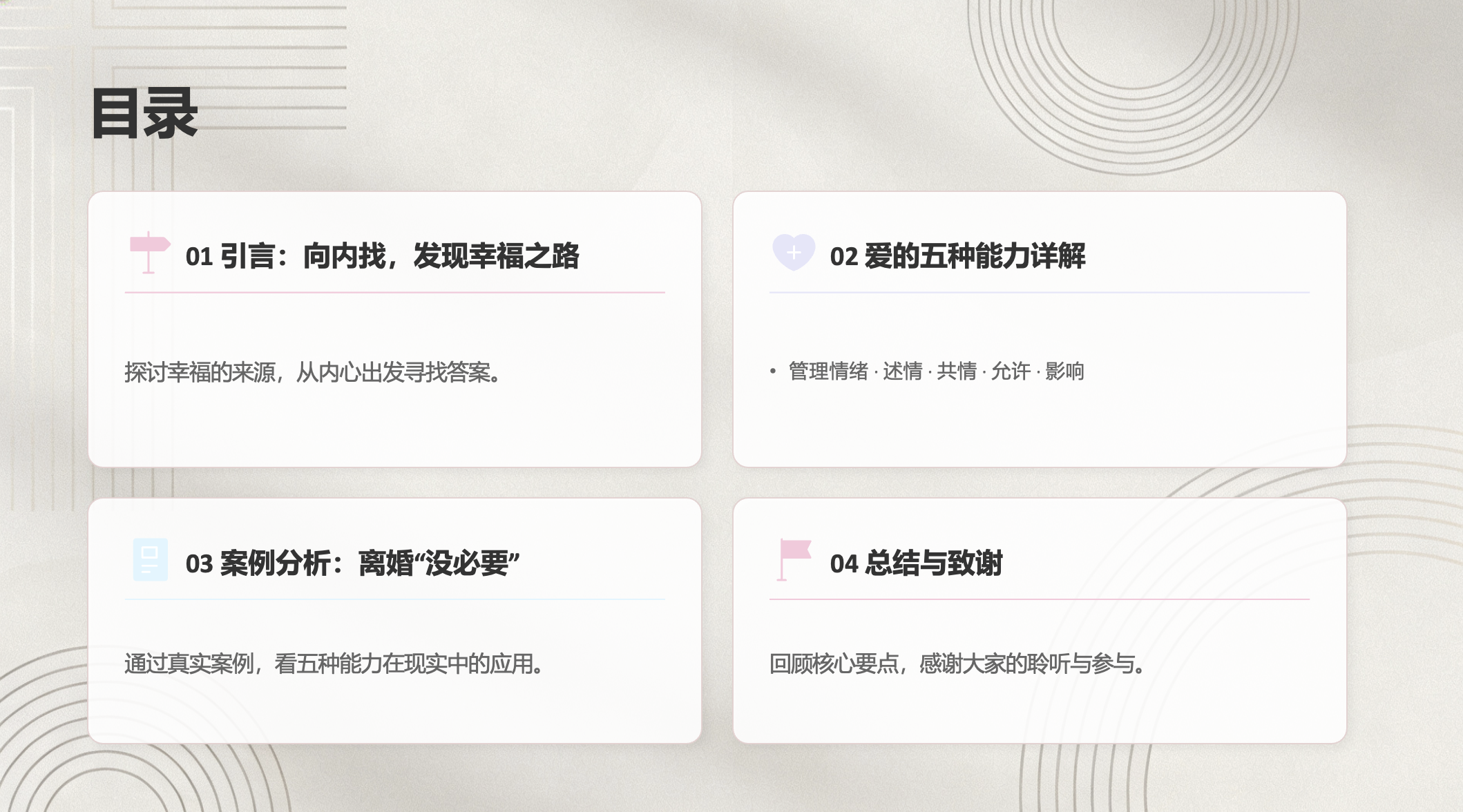 本次分享将分为四个部分。首先,我们会通过一个引言,探讨幸福的来源;接着,将详细解读书中提出的五种核心能力;然后,通过一个真实的案例,看看这些能力如何在现实中应用;最后进行总结。希望能让大家对爱的能力有一个全面而深入的理解。