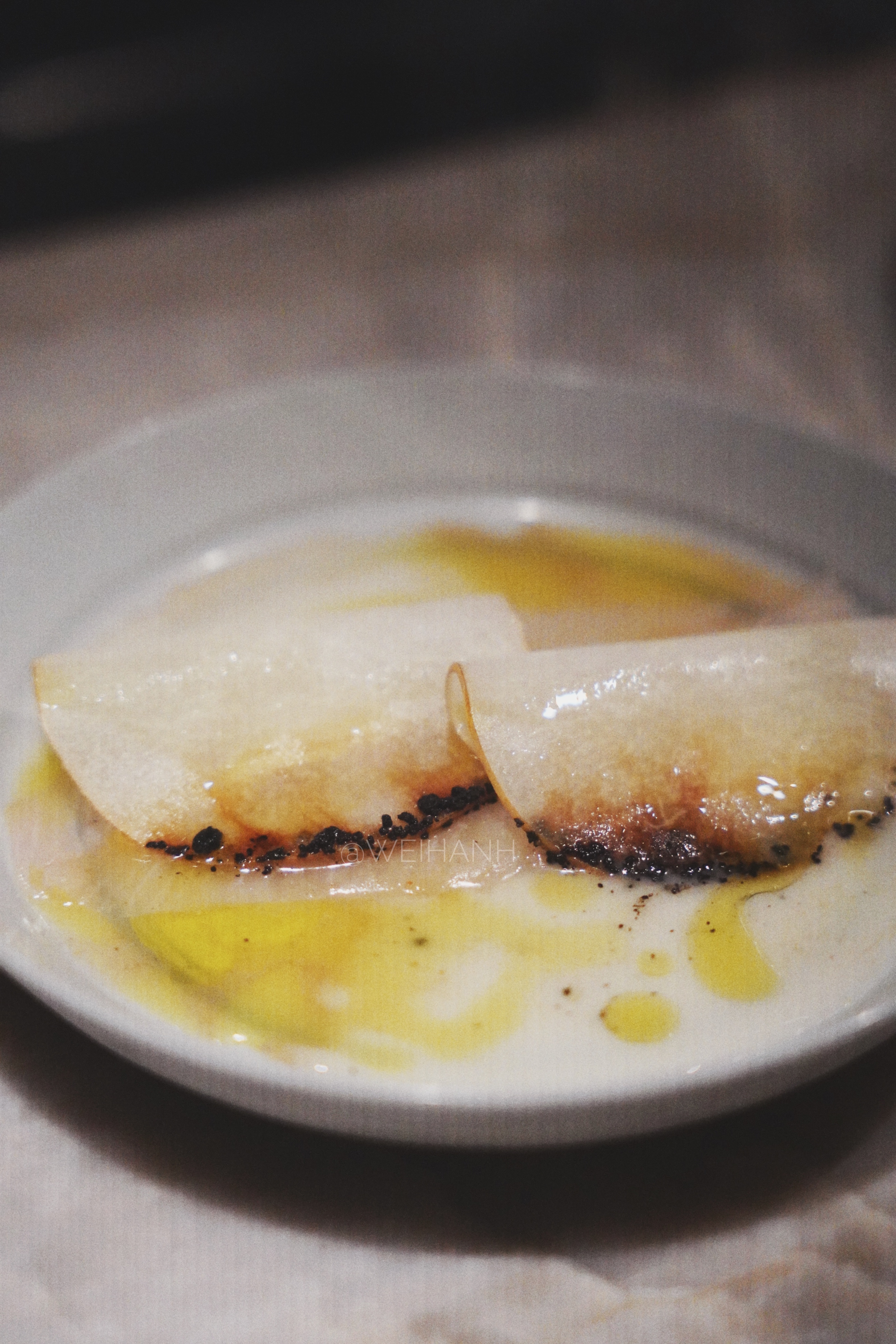 • 秋月梨、橄榄油、柠檬酸和熟成鱼片叠在一起,清甜、明亮、非常干净。