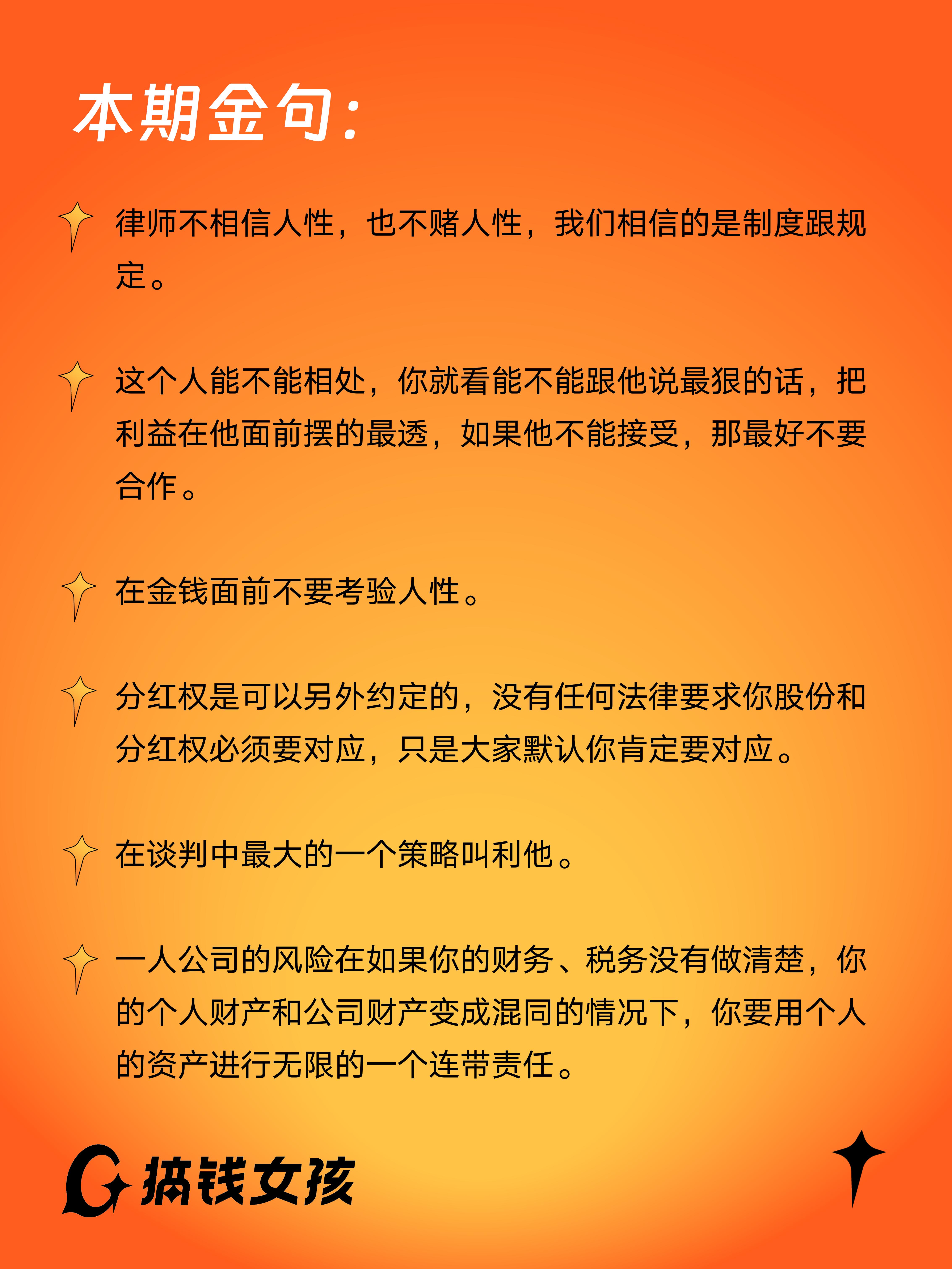 在我创业两周年之际,特别邀请了我的大姐小染来做飞行主播,拉上她20年的好朋友王燕律师,一起聊聊创业过程中最容易踩的那些坑。从公司注册、合伙人选择、合伙退出机制再到对外合作等常见场景,逐一为你排雷。
