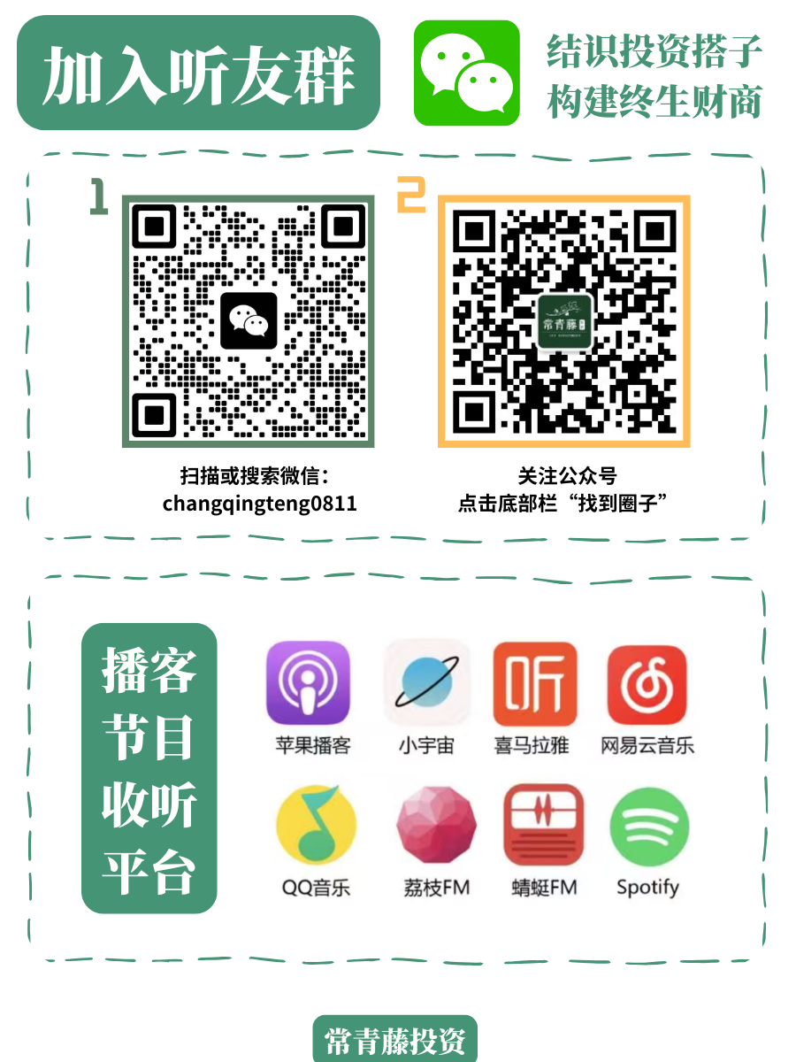 欢迎加入我们的听友群,成为“藤友”!可以关注公众号【常青藤投研】,点击底部菜单栏、获取小助手的二维码、拉你入群。每天加的人比较多,若显示添加频繁,请耐心等待~