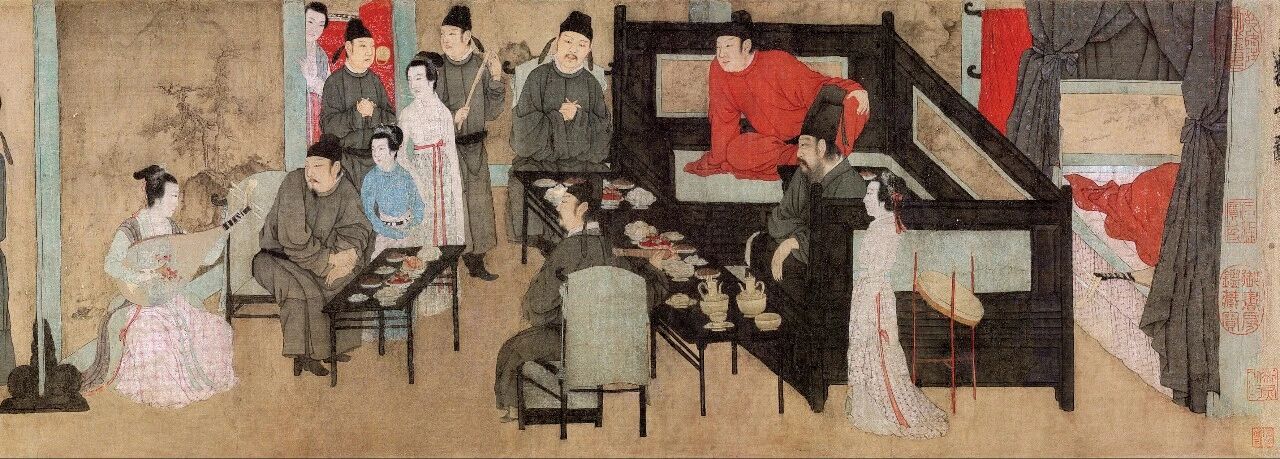 韩熙载常常在夜晚举办宴会,传言说,他家宴会上常常发生荒唐之事。南唐后主李煜听说了,就派画师顾闳中去参加宴会,把实况画下来给他看。于是就有了这卷《韩熙载夜宴图》。