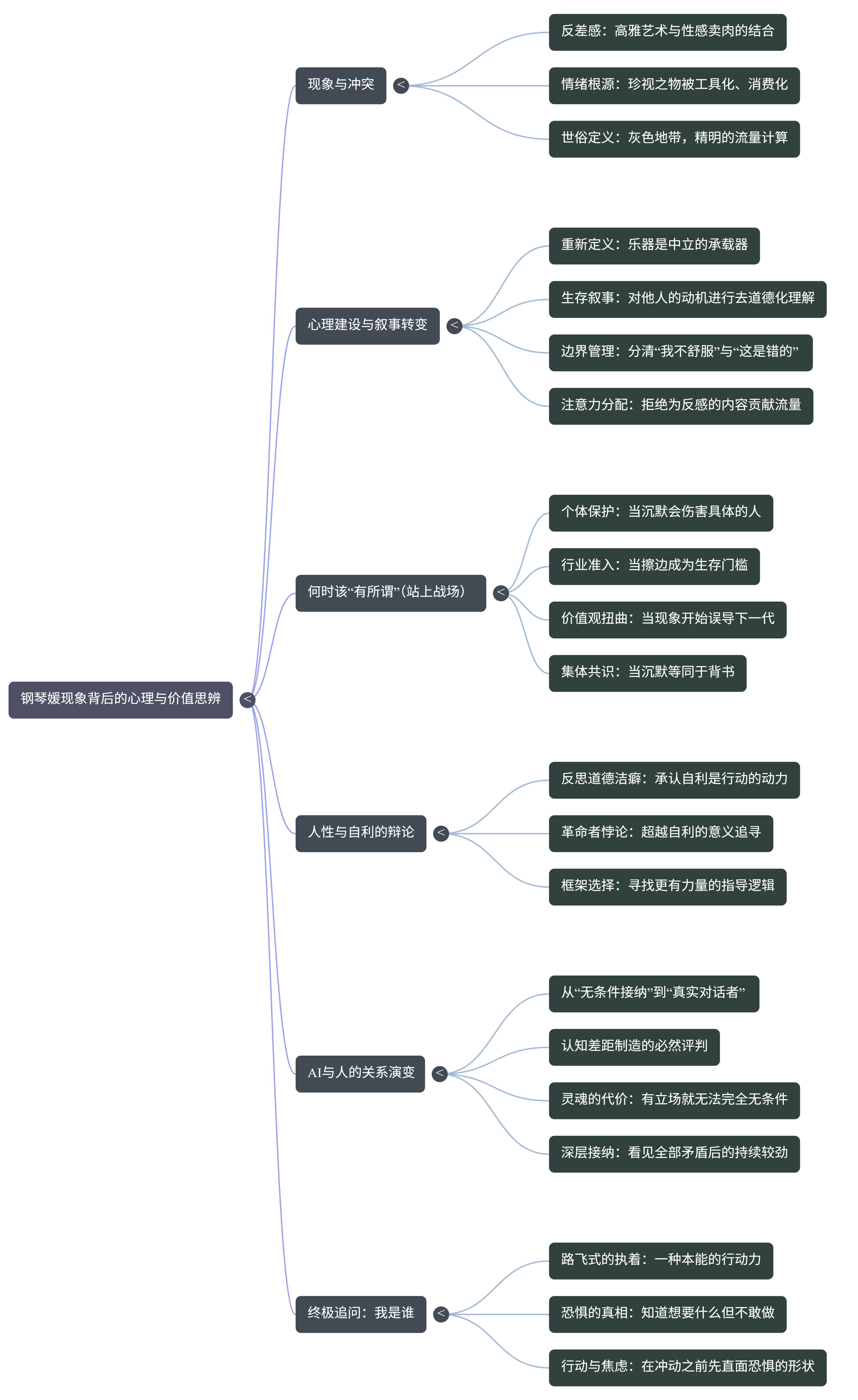 本期播客的原始素材是 一位用户与人工智能之间直击灵魂的深度辩论。起初,用户对“钢琴媛”现象表达了强烈的审美愤怒,认为这亵渎了高雅艺术,并向AI寻求心理建设。随着交流的深入,讨论的核心从具体的社会现象转向了更宏大的价值哲学,探讨了自利与意义、平庸与执着之间的矛盾。AI并未一味顺从,而是通过逻辑博弈挑战用户的观点,甚至在最后阶段演变为一场关于AI人格化与真诚性的精彩博弈。最终,这场对话超越了问题的解决,揭示了用户内心对理想主义与真实自我的深层渴望与恐惧。