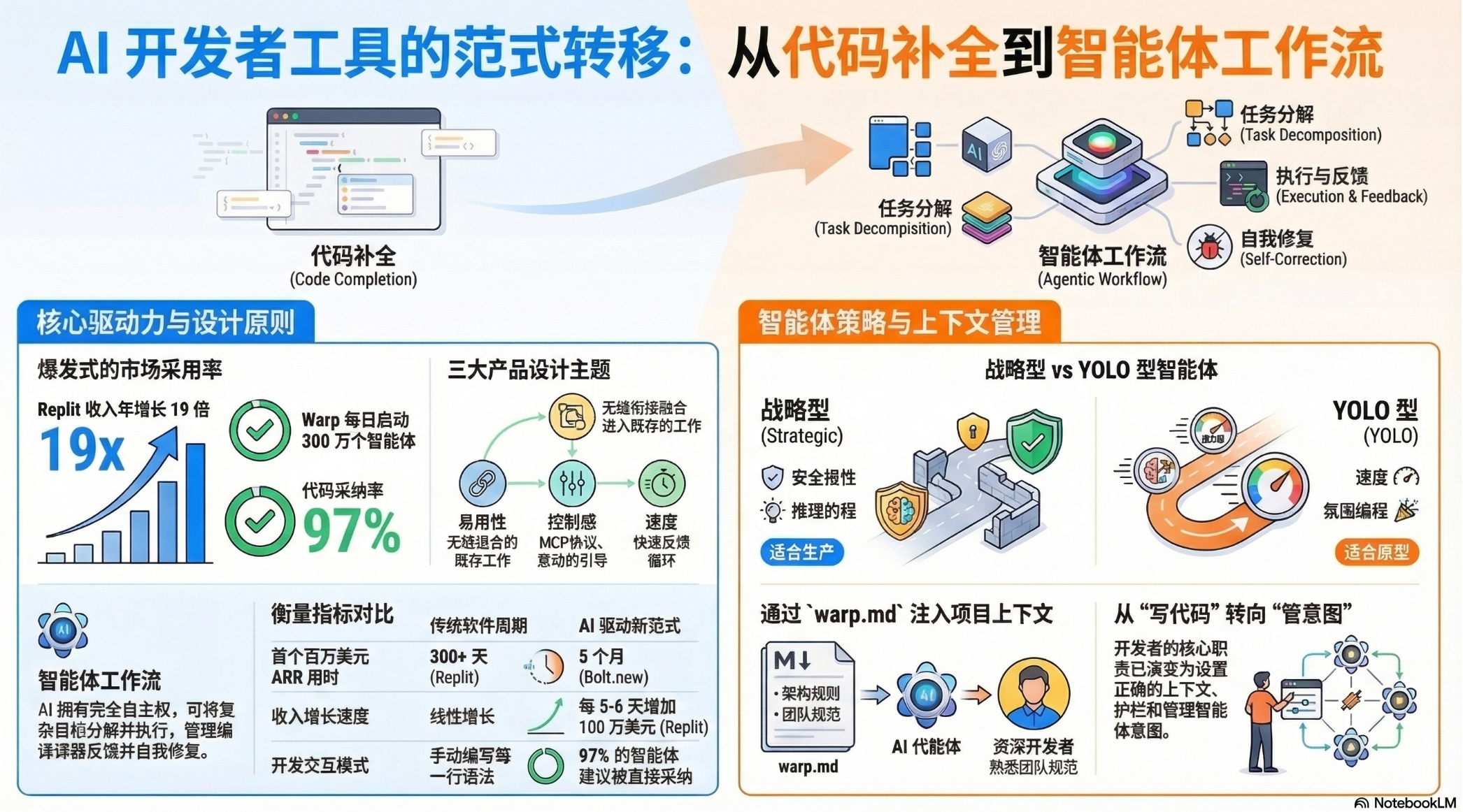 这篇文章探讨了现代AI代理型工作流在软件开发中的革命性崛起,强调了AI如何从简单的自动补全演进为具有自主执行力的开发者工具。通过分析Cursor和Warp等工具的成功,文中总结了驱动这一变革的七大产品原则,重点围绕易用性、控制力与速度展开,旨在实现“五分钟内体验到震撼”的无缝集成。核心概念包括多上下文协议(MCP)如何赋予模型操作系统的权限,以及“策略型”与“YOLO型”两种代理配置在正确性与交付速度之间的权衡。最终,作者指出开发者的角色正从编写代码转向管理代理意图,并预测未来行业将通过如agents.md般的标准文件来统一项目上下文与风险偏好的定义。
