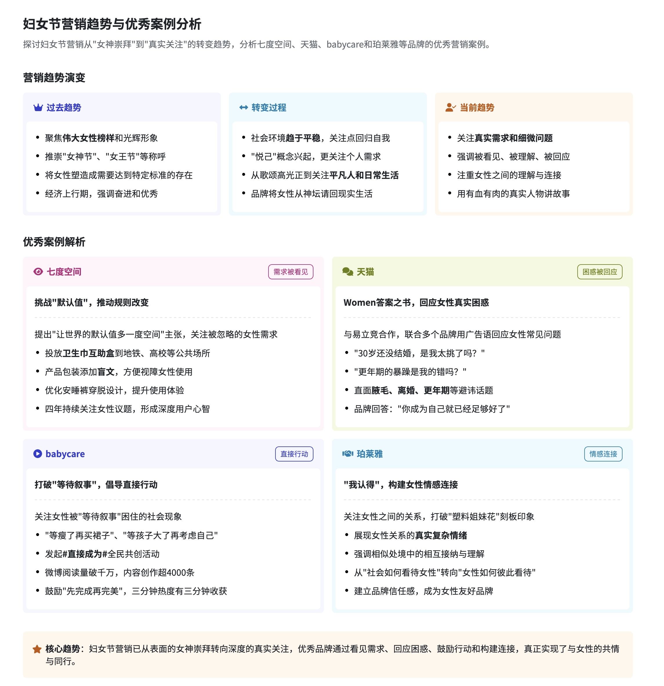 这期我们从妇女节品牌营销聊起,通过七度空间、天猫、Babycare、珀莱雅四个品牌案例,分享了这些年我们看到的营销风向新变化——从歌颂“女神”“女王”转向关注普通女性的内心困惑与真实需求。