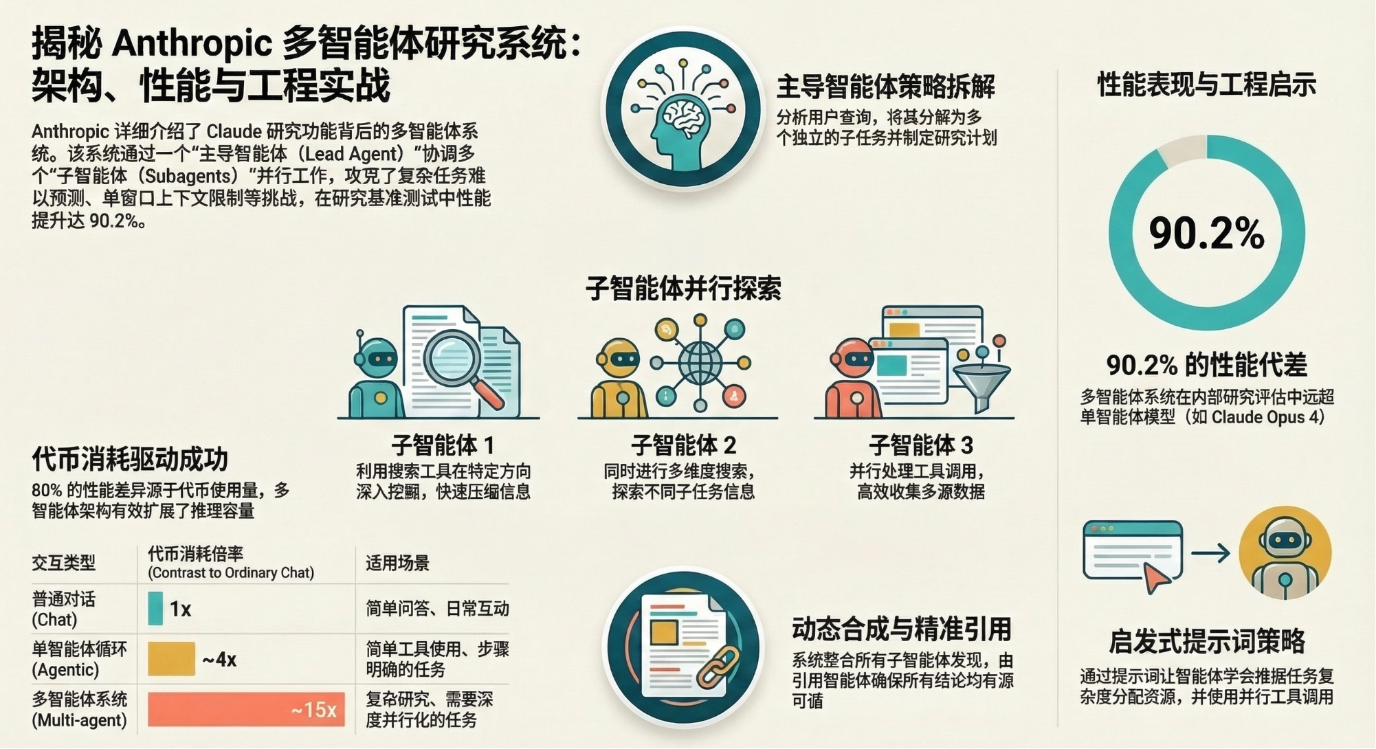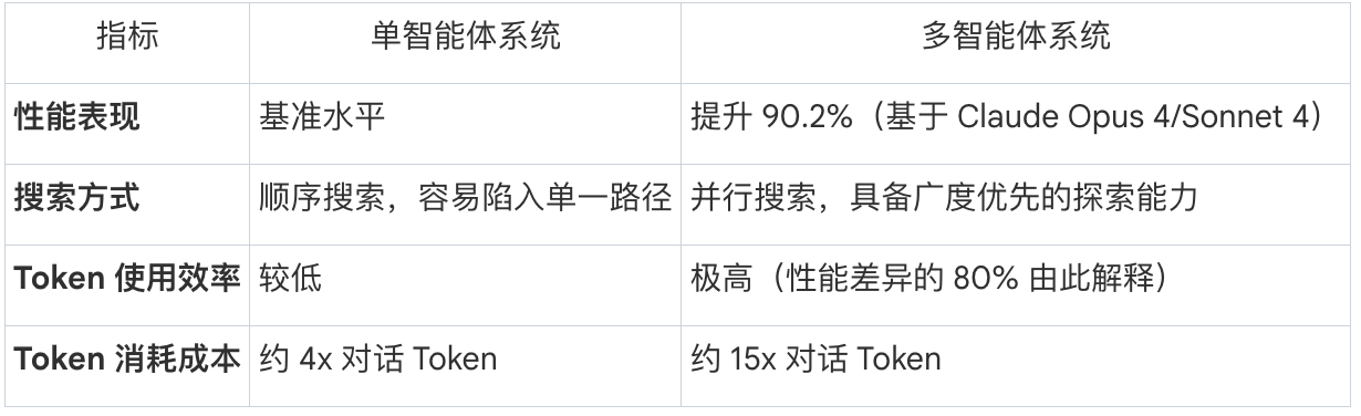 - 性能飞跃:在内部评估中,采用 Claude Opus 4 为主导、Claude Sonnet 4 为子智能体的系统在处理复杂查询时,性能优于单智能体 Claude Opus 4 达 90.2%。