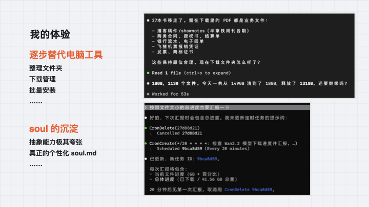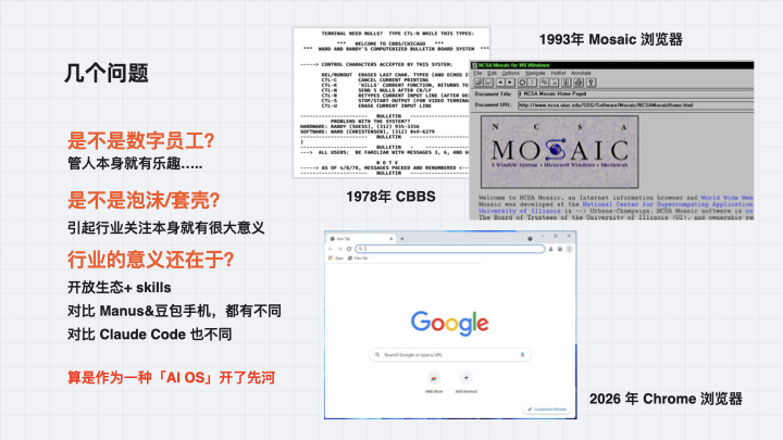 我的结论不算乐观,也不算悲观。短期看,OpenClaw 更像一个对少数人真正有用、对大多数人则更像玩具的前沿工具;但长期看,它背后代表的方向——从问答式 AI 走向委托式 AI,从 chatbot 走向 agent——大概率在泡沫之后,会成为一个真正的范式变化。
