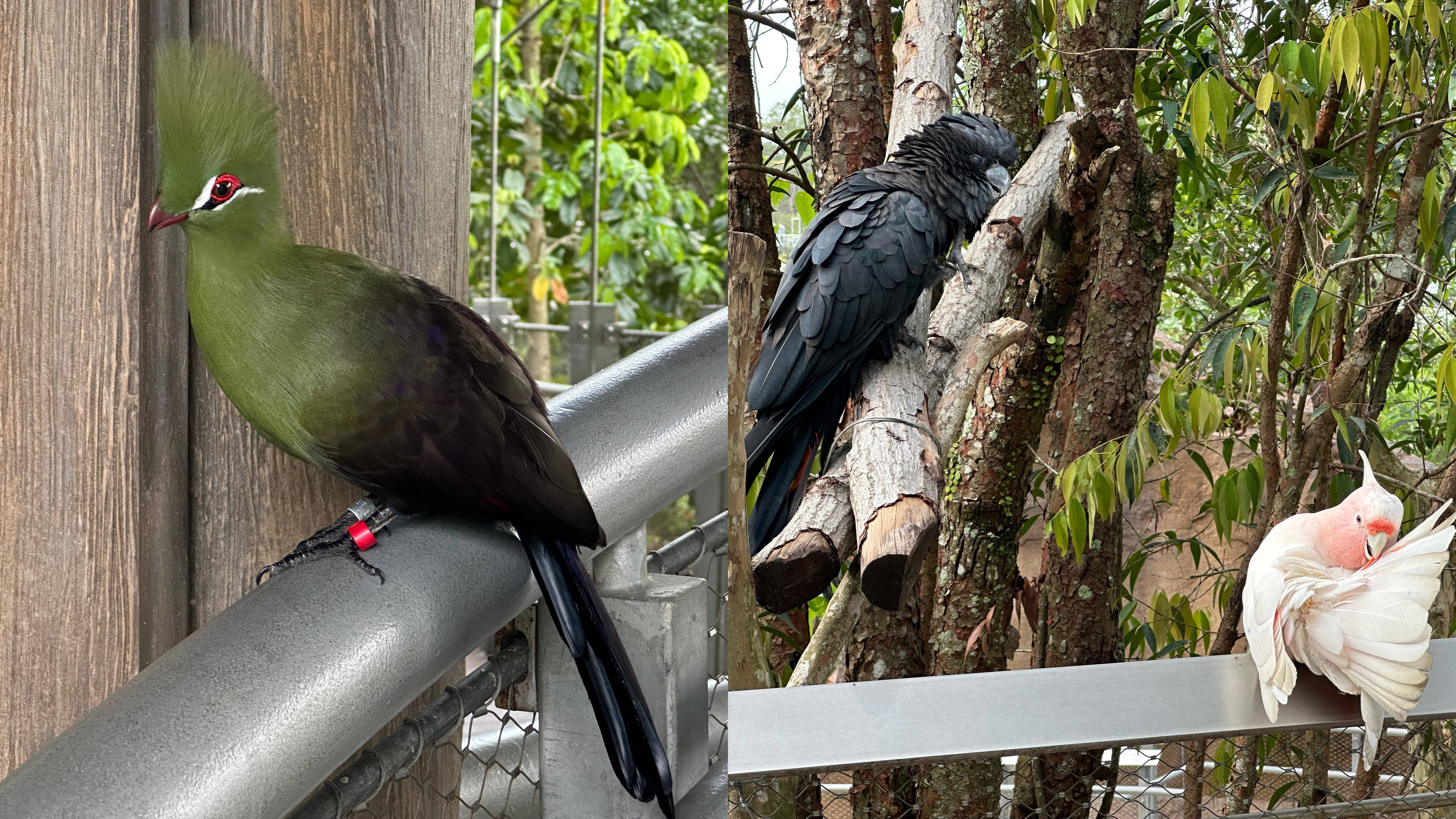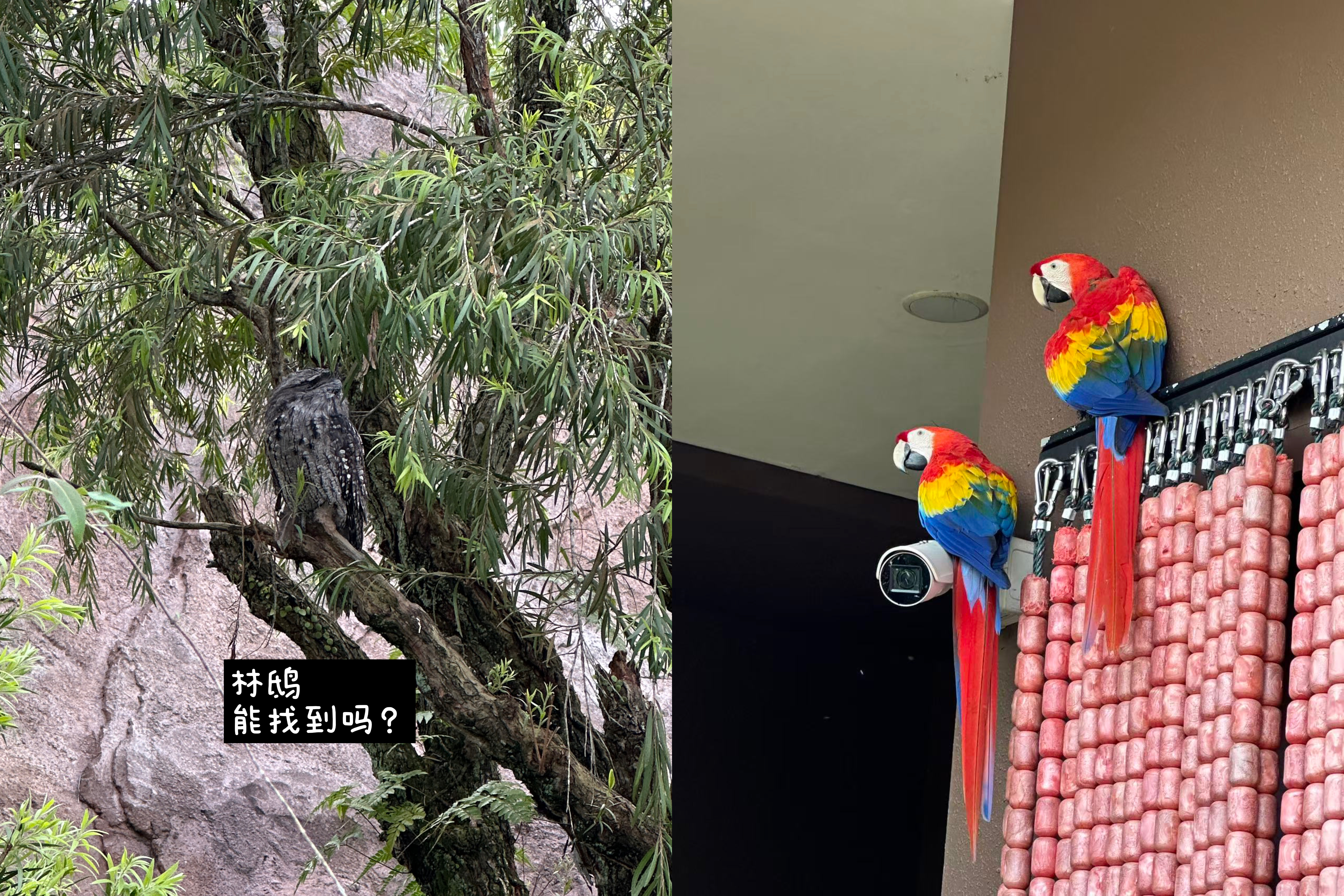 隐藏成树干的林鸱(左)与捣乱中的绯红金刚鹦鹉(右)