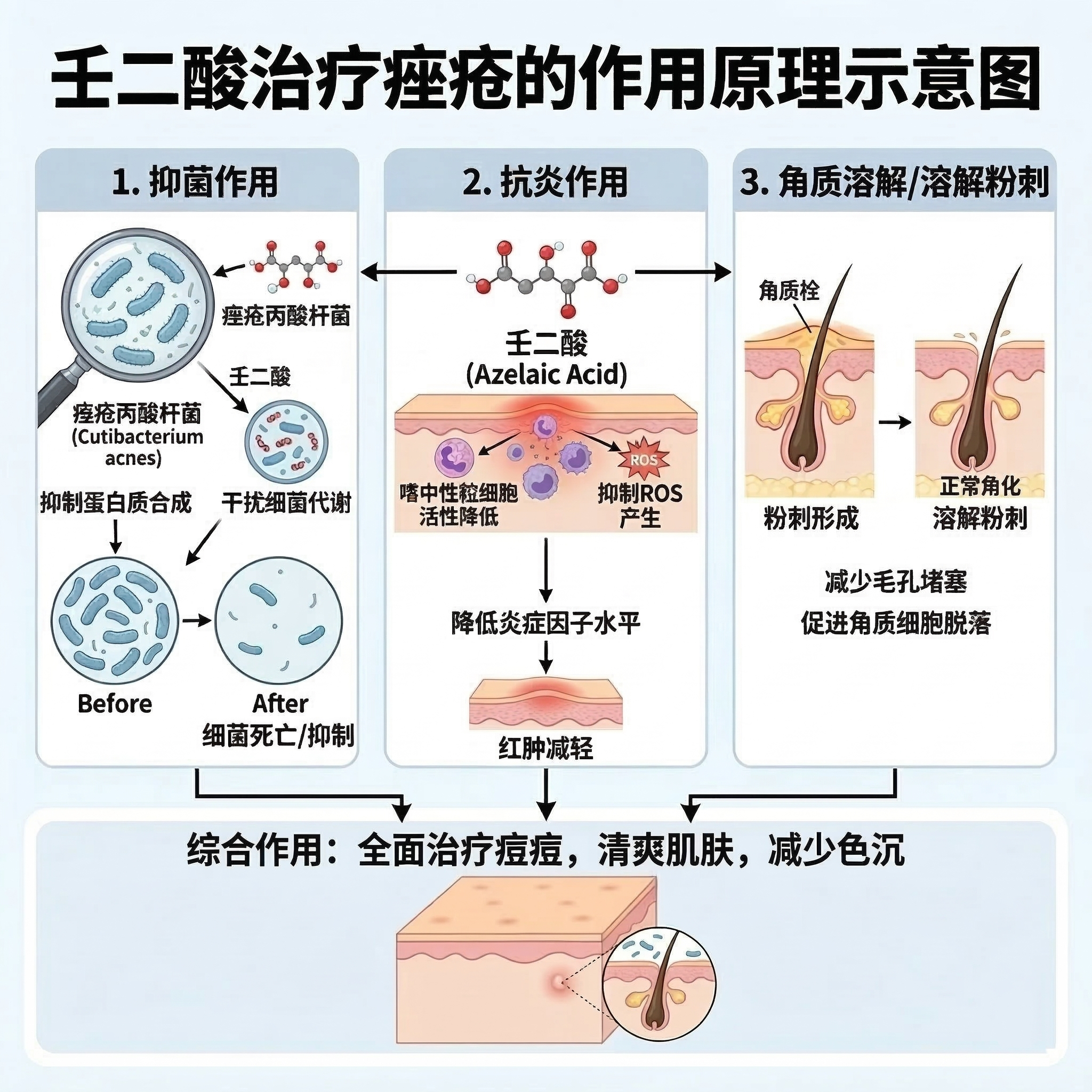 壬二酸是临床解决炎症性痤疮的“全能选手”。它能通过抑制蛋白质合成来杀灭痤疮丙酸杆菌,并降低炎症因子水平,有效平息局部的红肿反应。同时,壬二酸具备溶解角质、疏通毛孔的作用,能从物理层面减少毛孔堵塞并促进角质细胞正常脱落。主播强调,壬二酸在改善炎症期丘疹以及后期红黑痘印方面表现出色,常作为“鸡尾酒疗法”中的核心酸类,帮助求美者精准重建健康的皮肤内环境 。由于专业酸类浓度较高,请务必在专业医生指导下进行治疗。