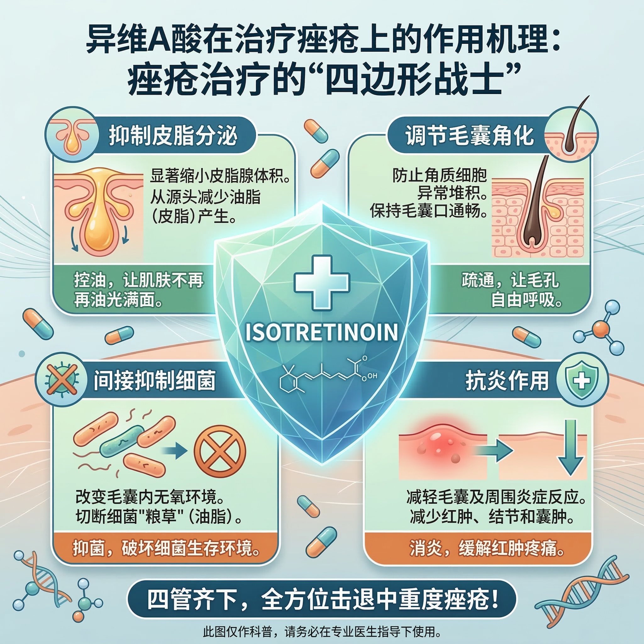 异维A酸被誉为痤疮治疗的“四边形战士”,能同时作用于抑制皮脂分泌、调节毛囊角化、抗炎及间接抑菌四个靶点。作为皮肤科三大用药里程碑之一,它能显著缩小皮脂腺体积并保持毛囊口通畅,是中重度结节囊肿型痤疮的首选方案。主播强调,虽然其副作用条目较长,但在医生监测下风险完全可控,属于利大于弊的“良医” 。请务必在专业医生指导下使用,用药期间及停药后需严格避孕。