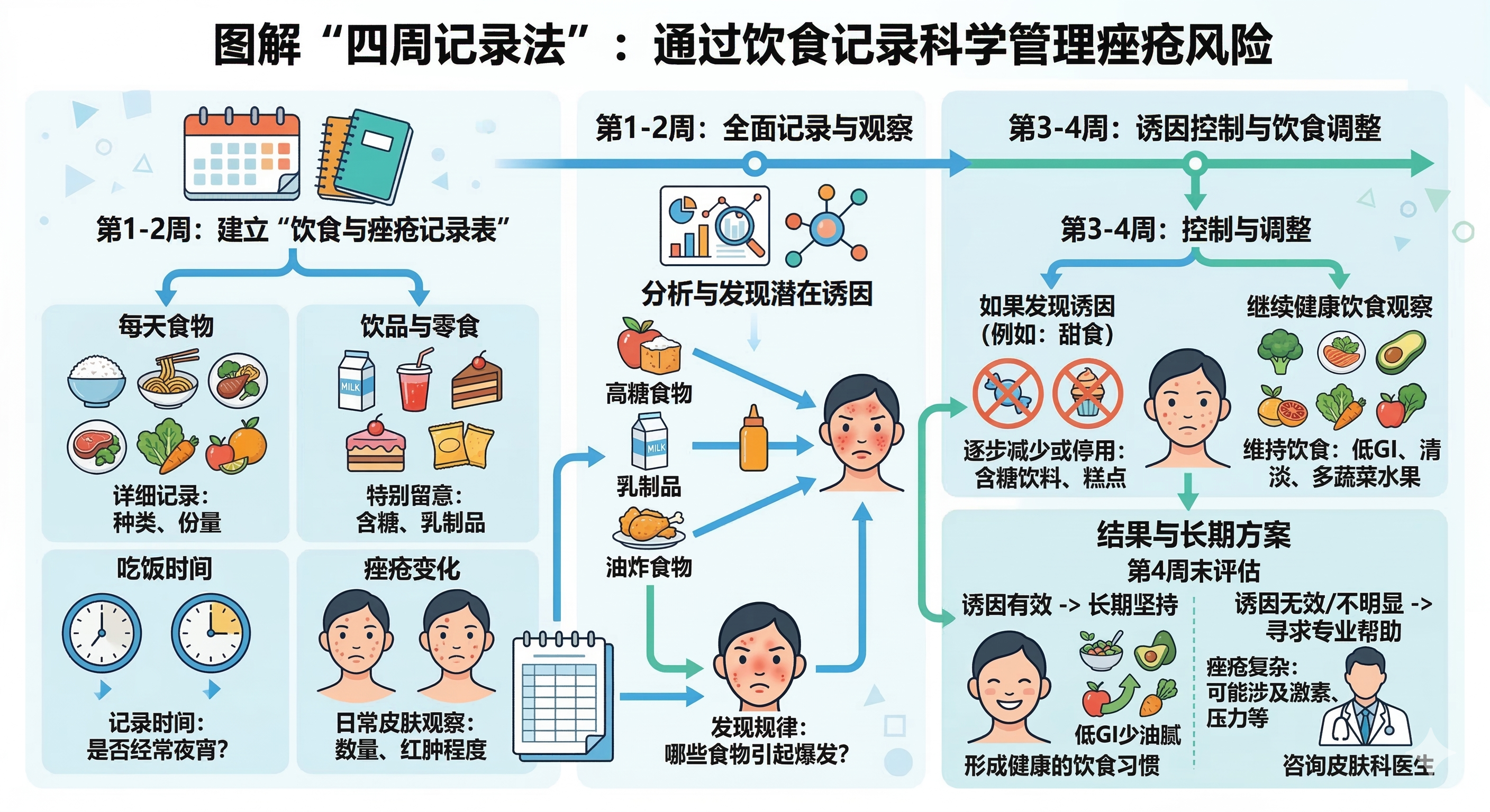 主播在节目中提到的“四周记录法”是源自 2024 年痤疮诊疗指南的科学管理手段 。前两周通过详细记录每日饮食(特别是奶制品、甜食、油炸食品)与皮肤红肿、数量的变化,旨在找出专属于你个人的“催痘炸弹”。后两周则进入诱因控制阶段,通过减少高 GI 食物摄入并观察皮肤改善情况,建立长期的健康饮食习惯。这种方法能帮助大家精准识别个体差异,避免盲目忌口。如果四周后改善不明显,建议咨询专业医生排查激素或压力等深层因素。