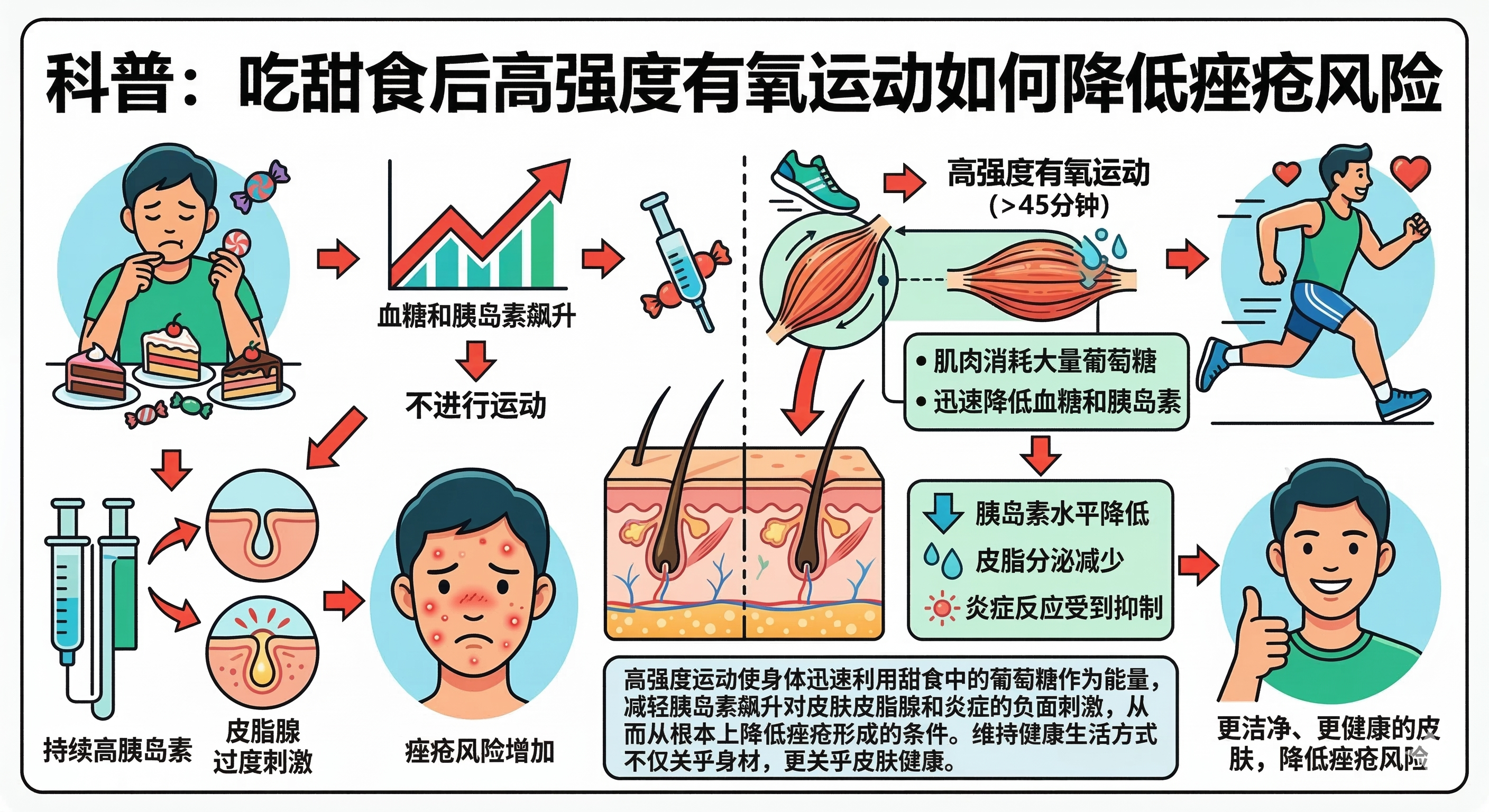 如果您实在无法拒绝甜食的诱惑,严医生在节目中给出了一个硬核对策:通过高强度有氧运动来拦截皮肤的炎症反应。摄入甜食后,血糖和胰岛素会迅速飙升;如果不及时代谢,持续的高胰岛素水平会过度刺激皮脂腺分泌,诱发或加重痤疮。通过 45分钟以上 的中高强度有氧运动,肌肉能迅速消耗血液中的葡萄糖,降低胰岛素水平,从而从根本上阻断“高糖致痘”的路径。维持皮肤健康不仅关乎护肤品,更关乎对生活方式的精准管理。