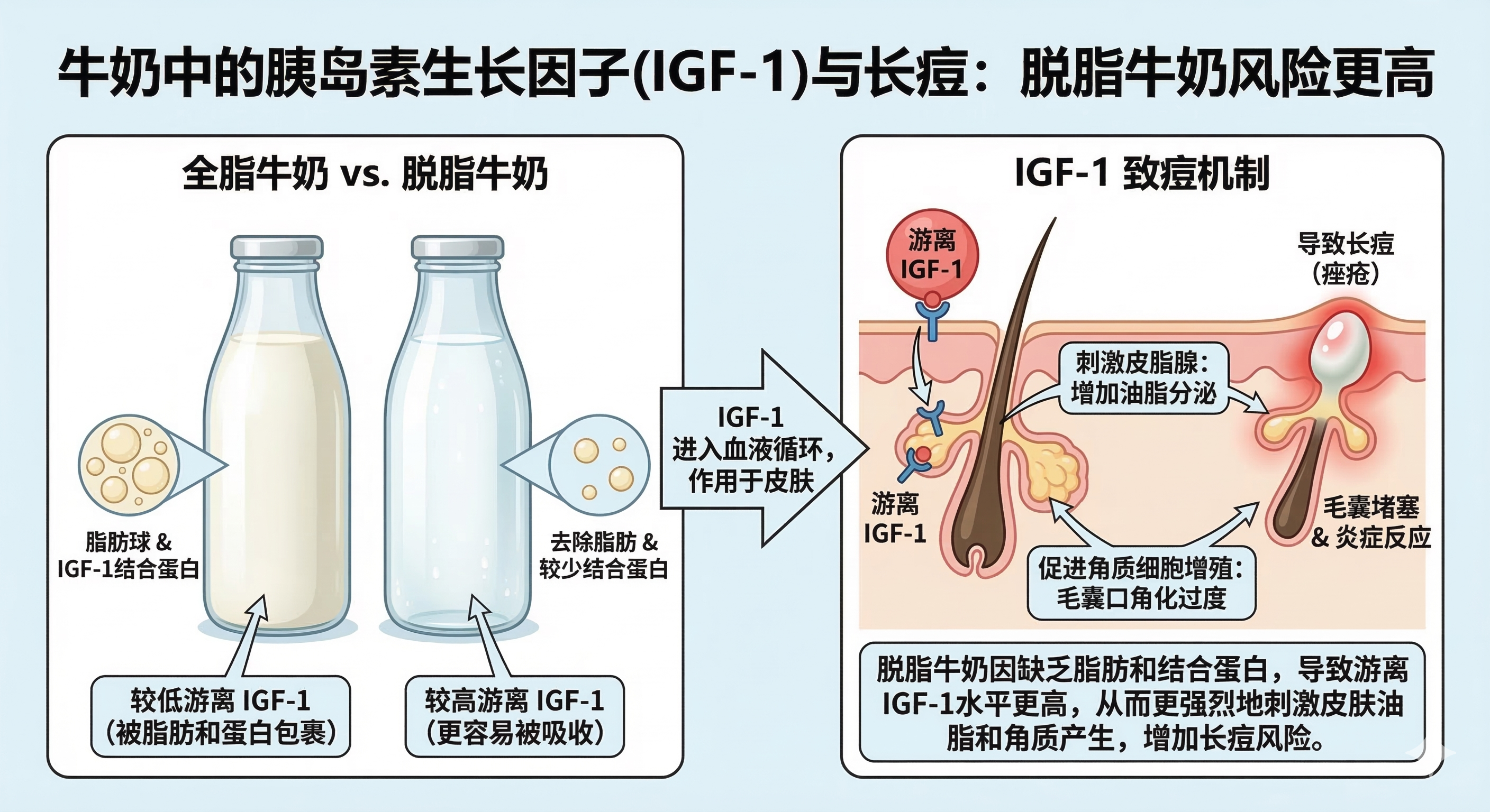 很多听众选择脱脂牛奶,却不知其致痘风险可能更高 。播客中提到,牛奶中的胰岛素样生长因子(IGF-1)会直接刺激皮脂腺增加油脂分泌 ,并促进毛囊口角化过度导致堵塞 。脱脂牛奶因缺乏脂肪和结合蛋白,导致游离的 IGF-1 水平更高且更易被吸收,从而更强烈地诱发炎症反应 。主播建议痤疮患者优先选择全脂牛奶,或摄入经过发酵、乳清蛋白被破坏的奶酪与酸奶 。