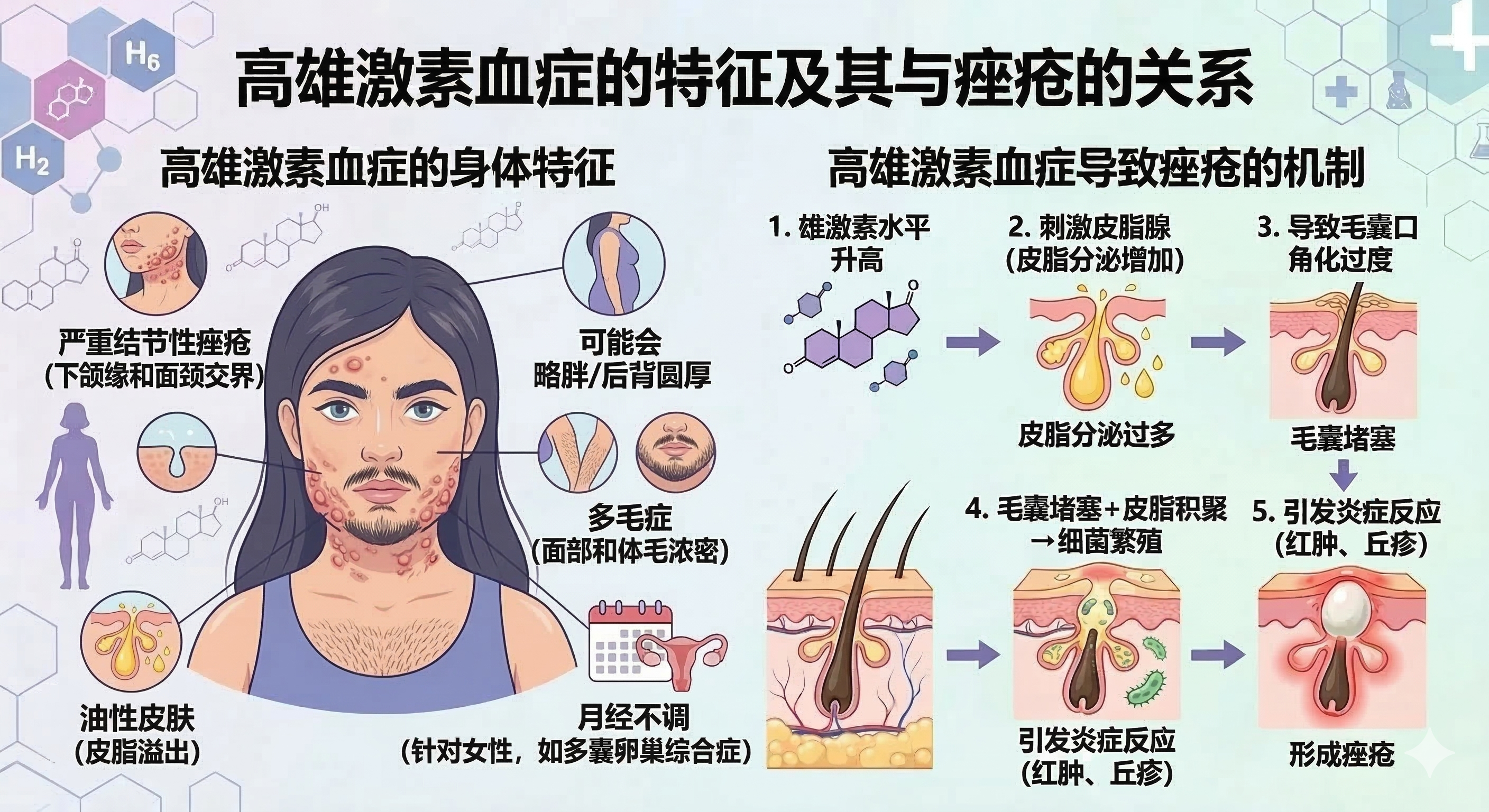 对于反复爆发、分布于下颌缘及颈部的严重结节性痤疮,需警惕“高雄激素血症”的可能性。除了皮肤表现,若伴随多毛症、月经不调、油性皮肤或体型变化,建议咨询医生排查内分泌诱因。机制上,雄激素水平升高会剧烈刺激皮脂腺分泌并导致毛囊口角化过度,形成堵塞与细菌滋生的温床,诱发顽固炎症。严医生特别提醒,即便血检数值正常,局部皮肤组织对激素的高敏感性仍可能是致痘主因,需通过专业临床评估进行针对性干预 。