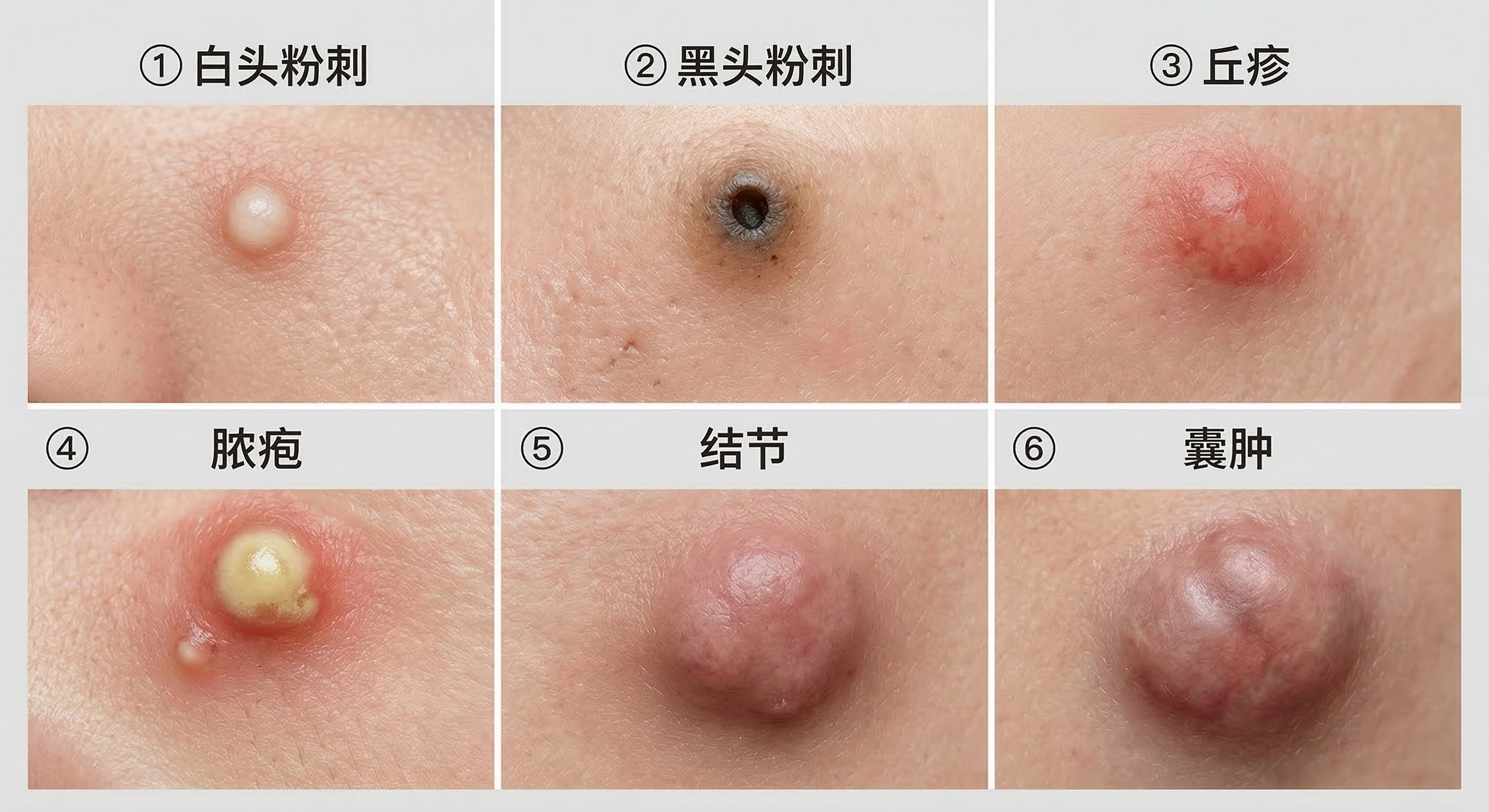 了解痤疮的不同形态是精准治疗的第一步。播客中提到的粉刺(1-2)是痤疮的初始阶段,常因油脂堵塞形成,建议通过果酸换肤等方式疏通毛囊口 。丘疹与脓疱(3-4)标志着炎症的升级,需配合水杨酸、壬二酸或光子嫩肤进行抗炎处理 。而成人女性痤疮高发的结节与囊肿(5-6),位置深、体积大且痛感强,处理不当极易留下永久性痘坑或色沉 。面对这类深层炎症,严医生特别强调切勿自行针清,建议咨询医生进行系统化干预 。