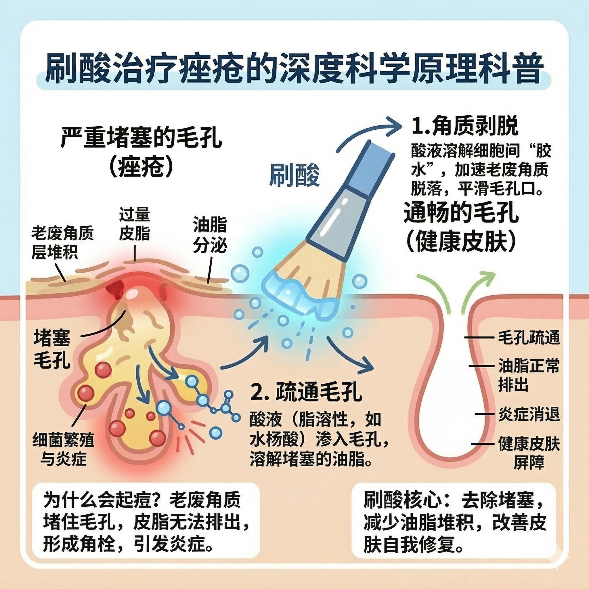 刷酸是通过溶解角质细胞间的“胶水”来剥脱老废角质,并渗入毛孔溶解堵塞的油脂,从源头切断细菌繁殖与炎症的链条。主播在节目中强调,专业的“鸡尾酒疗法”会根据皮损形态精准选酸:如针对非炎症性粉刺使用渗透更快的果酸(甘醇酸),而面对红肿丘疹则首选抗炎性能更优的水杨酸或壬二酸 。这不仅能重建表皮内环境、抑制痤疮丙酸杆菌,还能协同改善红黑痘印 。医美操作具有专业门槛,请务必在专业医生指导下进行。