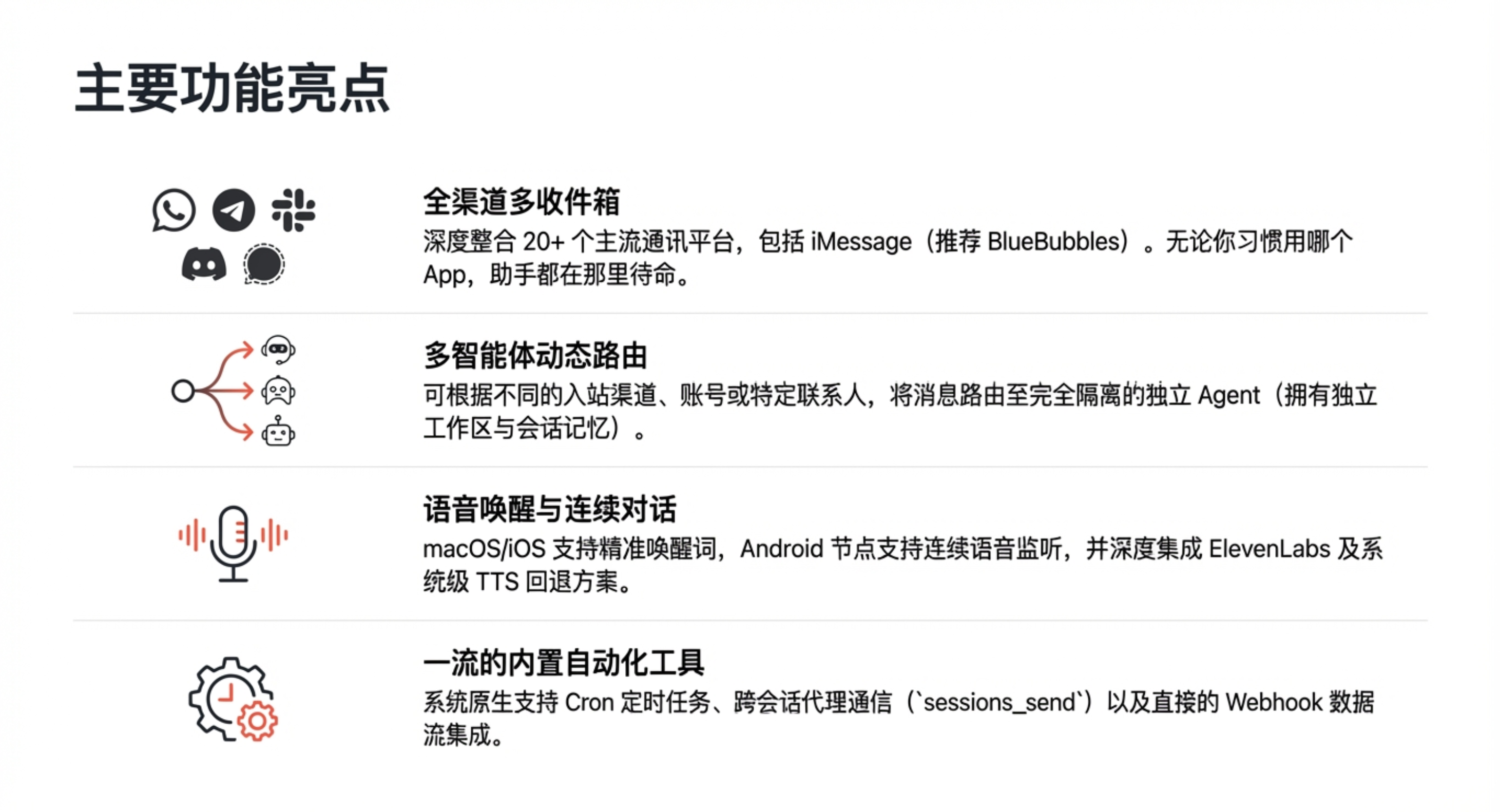 - 多代理路由:不同的入站通道、账户或对等体可以被路由到隔离的代理中,每个代理拥有独立的工作区和会话,互不干扰。