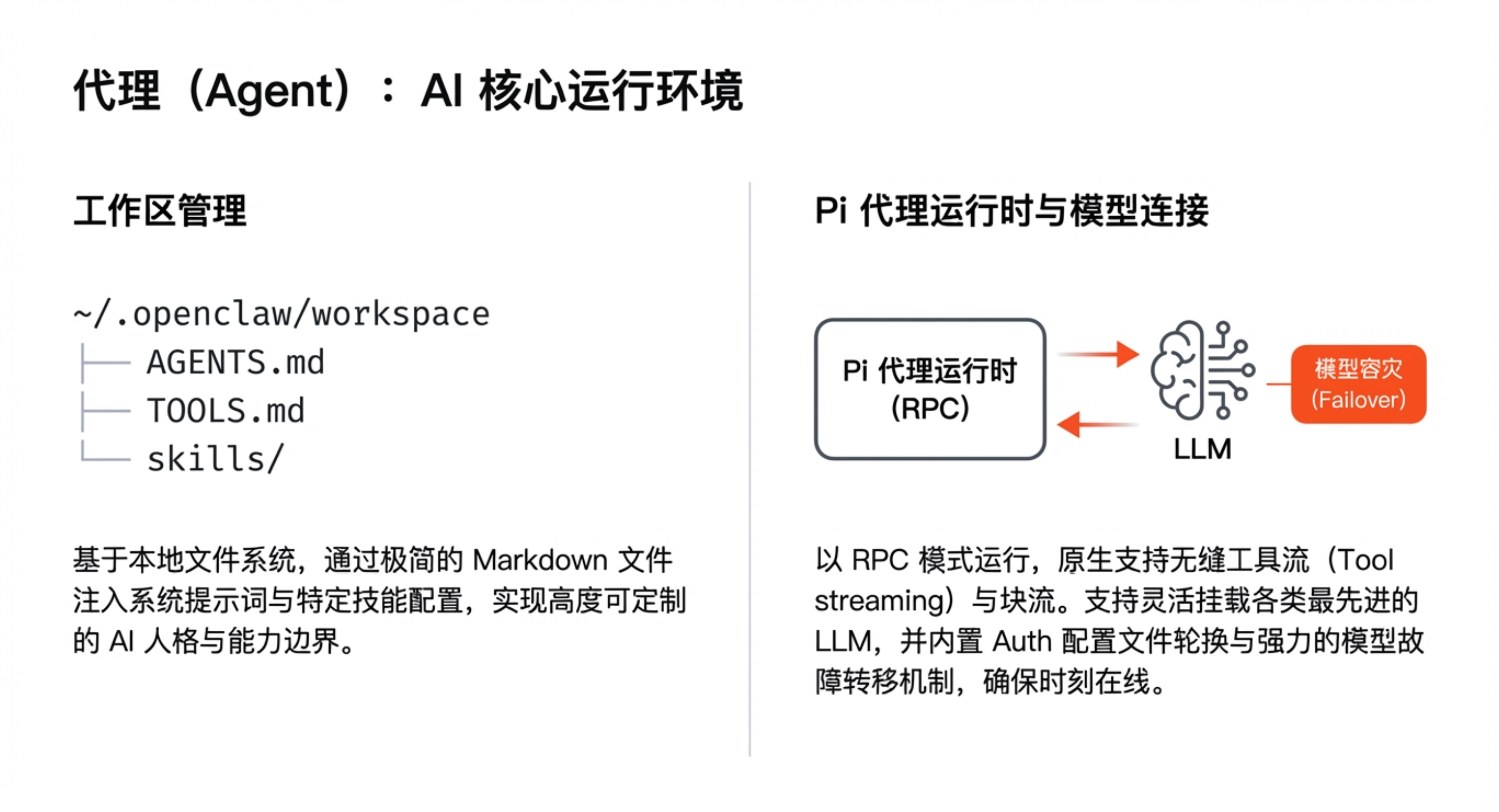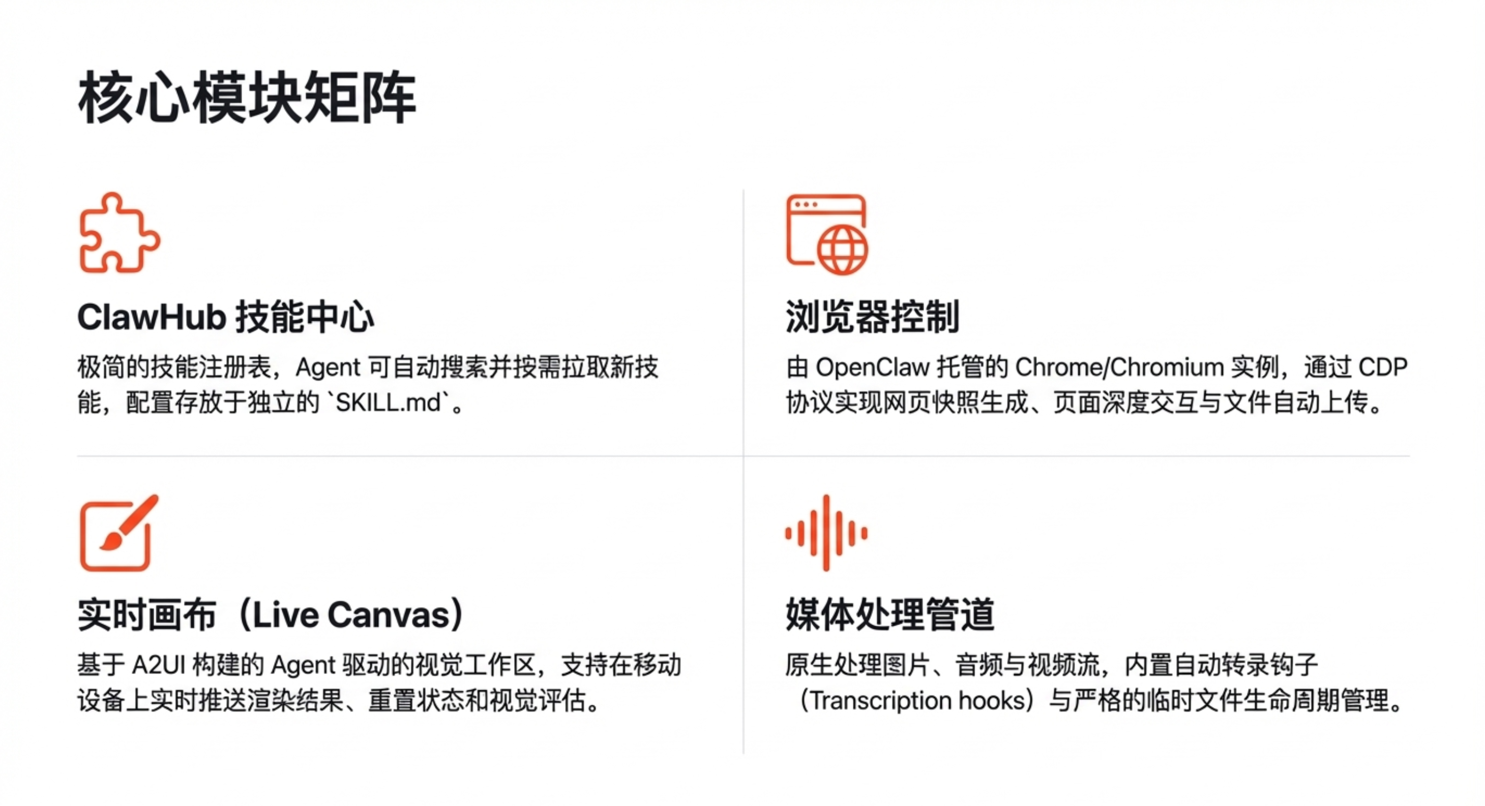 - 技能平台:这是 OpenClaw 的“App Store”。内置技能、管理技能和工作区技能之外,还有一个名为 ClawHub 的技能注册表。AI 可以自动搜索、拉取新技能,实现自我扩展。