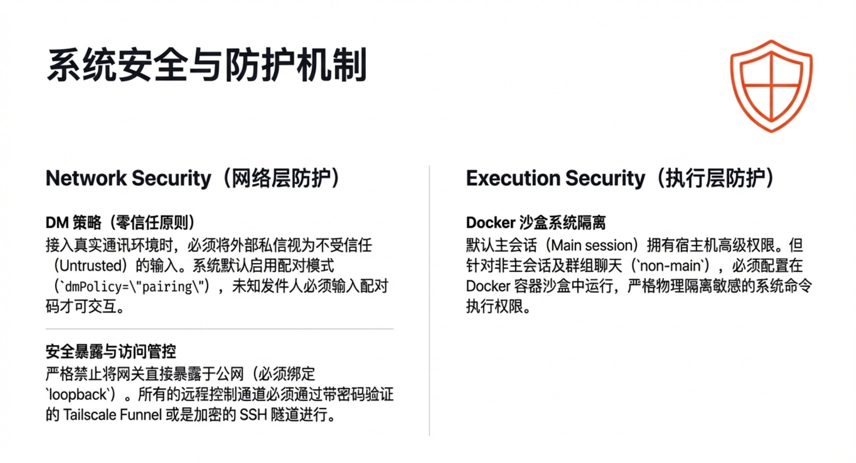 - 沙盒建议:对于高风险会话(如公共群组或外部频道),建议将其运行在 Docker 沙盒中,以限制其对主机的访问权限。