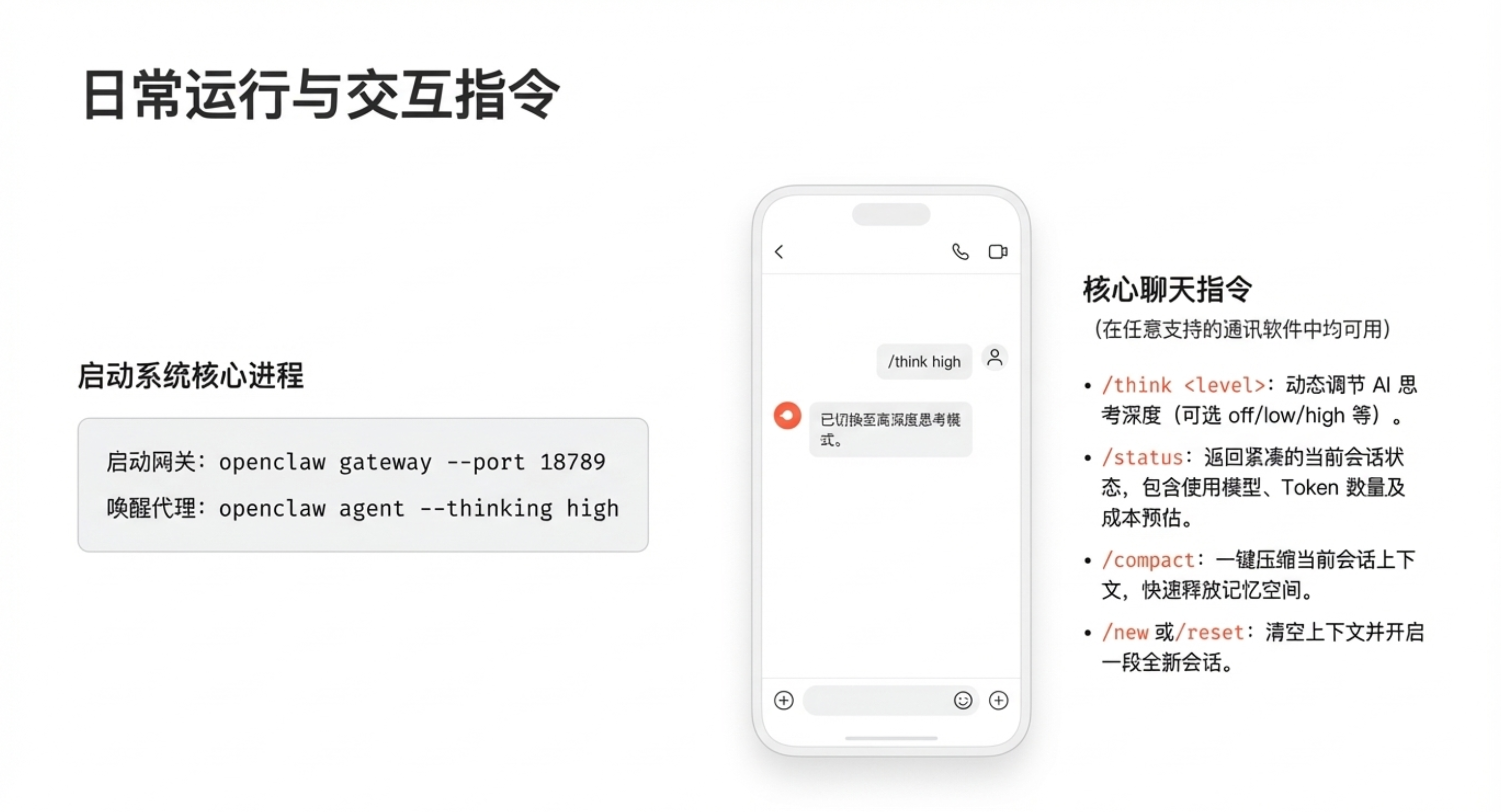- 会话管理:支持重置会话、压缩上下文、调整思考深度等高级控制命令。