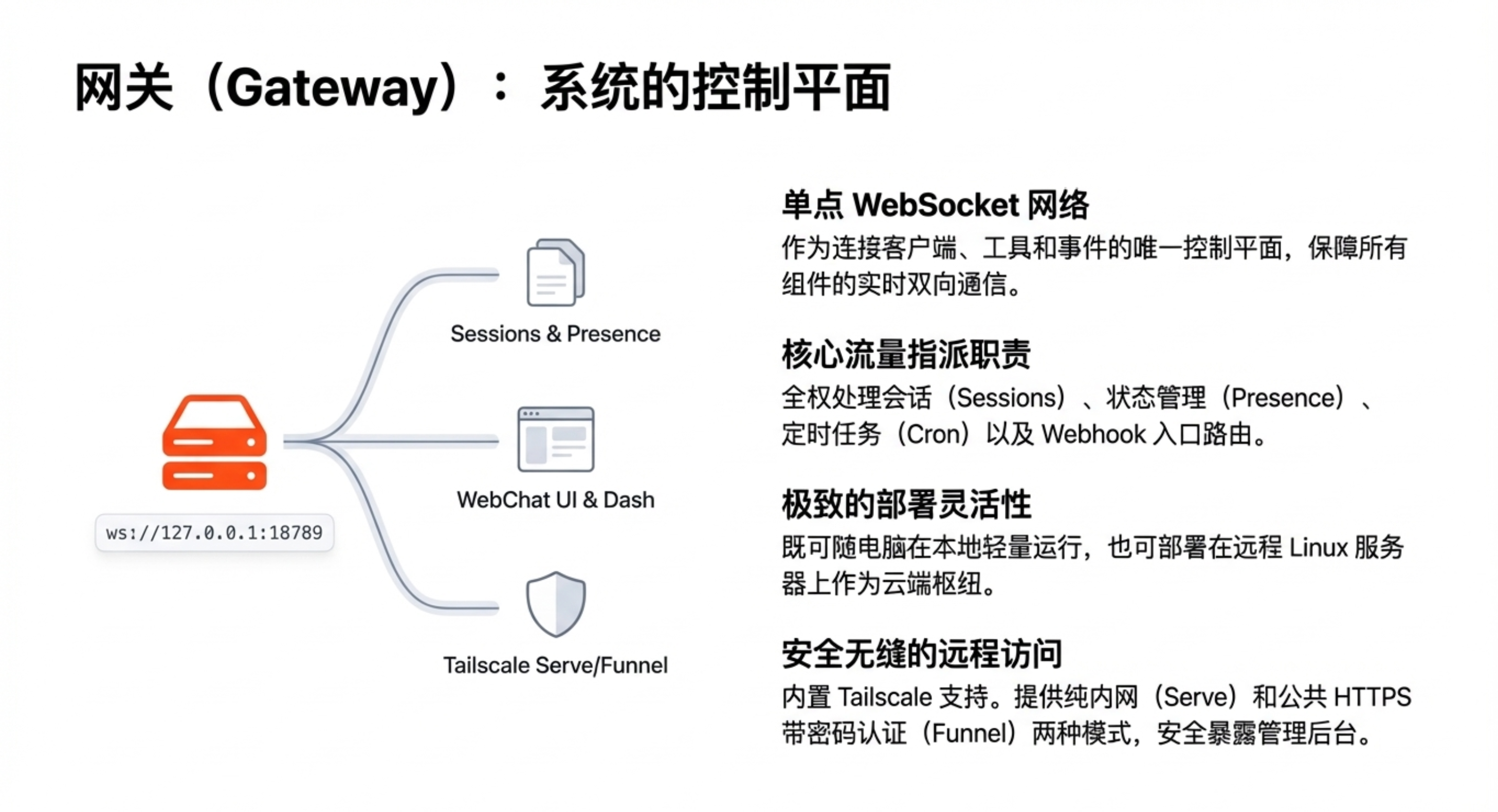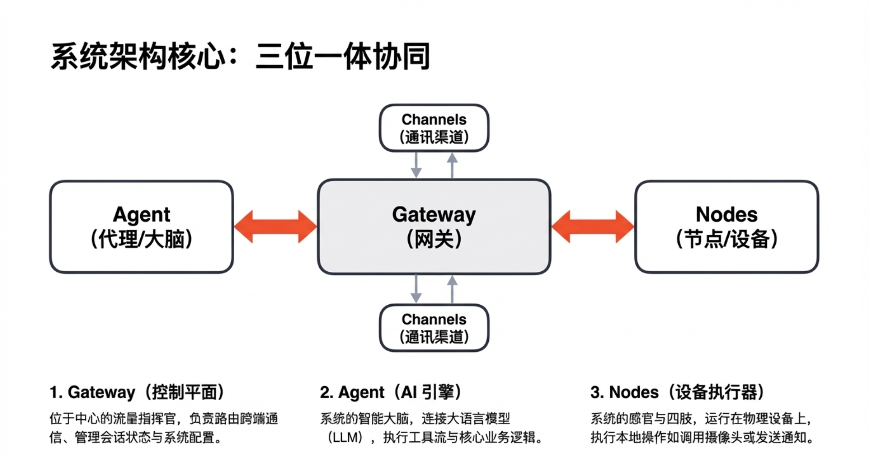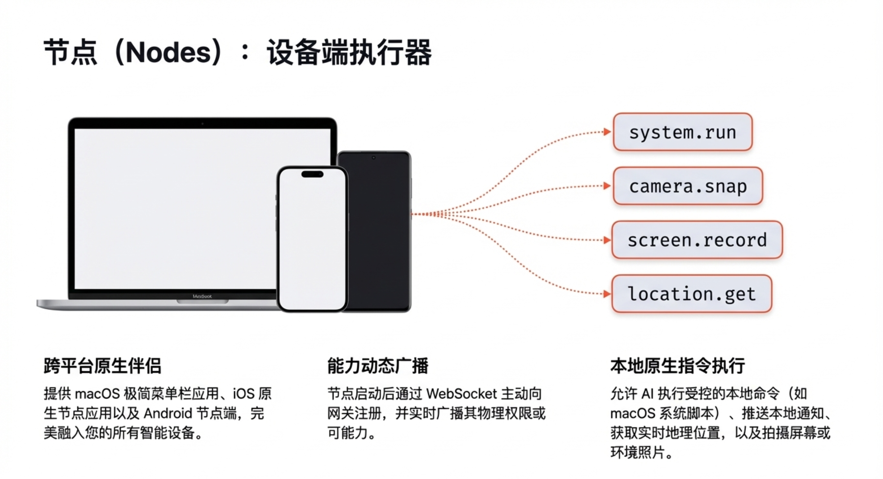 - 网关与节点分离:系统核心是一个网关,作为单控制平面,管理会话、通道、工具和事件。它通过 WebSocket 连接各类节点——可以是你的 macOS、iOS 或 Android 设备,从而调用本地功能(如摄像头、位置、通知)。