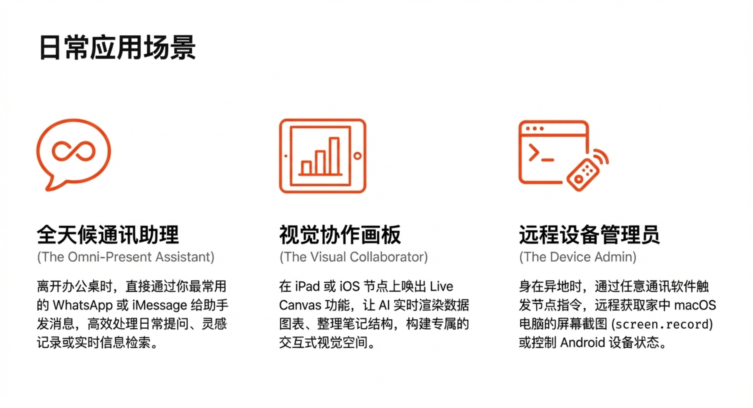 通过配套的 macOS 菜单栏应用、iOS 和 Android 伴侣应用,OpenClaw 能深度融入你的设备生态: