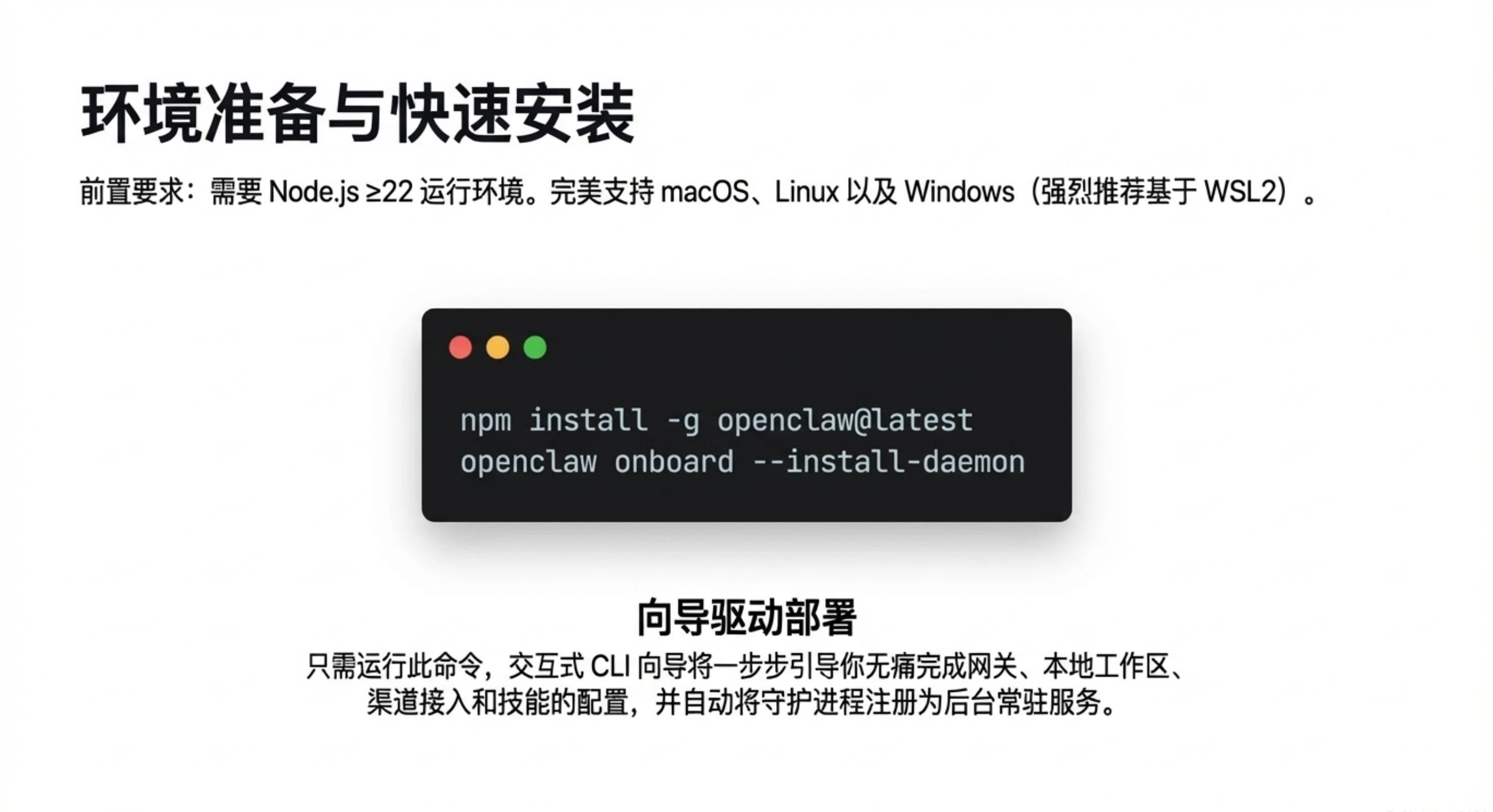 openclaw onboard,会分步指导你设置网关、工作区、通道和技能。 - 常用命令: