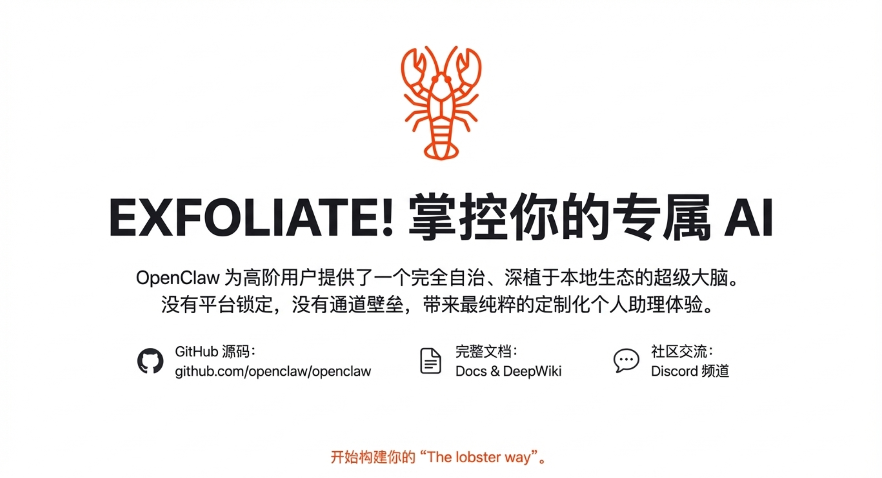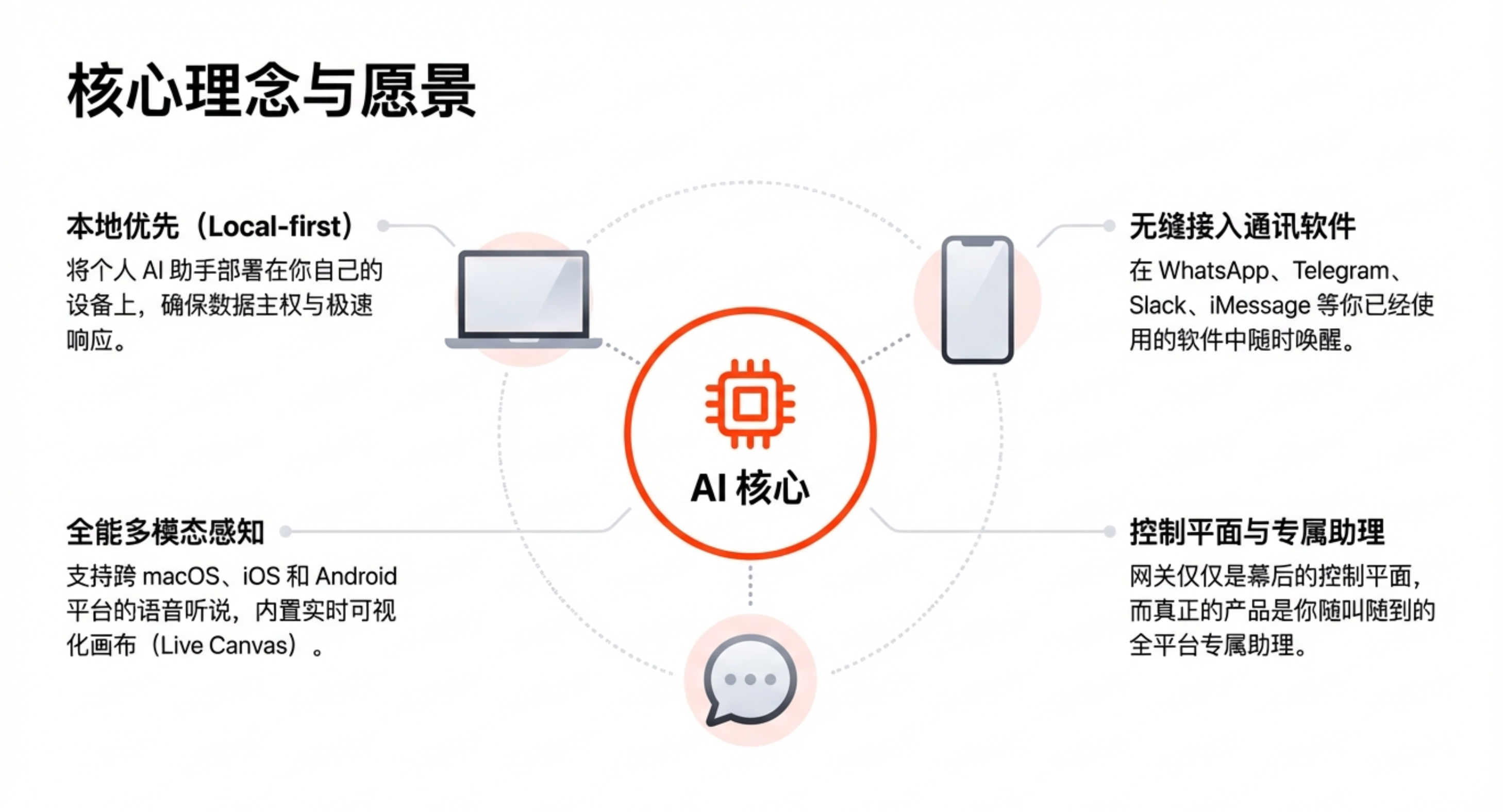 OpenClaw 的口号是“你的个人 AI 助手。任何操作系统。任何平台。龙虾方式”。其核心设计理念是本地优先——所有数据和控制都掌握在你自己手中。