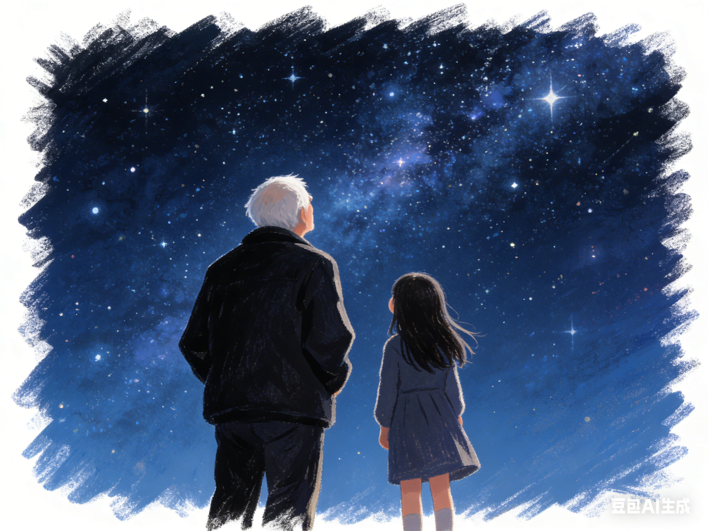 那天晚上,天很晴,星星特别多。小女孩指着天空说:“你看,奶奶在那边,还有好多好多人,都在那边。”