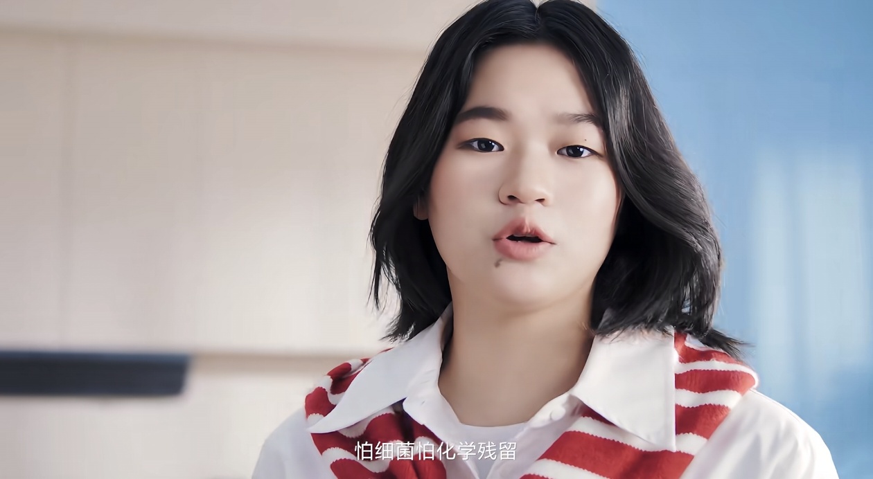 画面选的是最普通的厨房,用的是浅米色和白色这种低饱和度的色系,再点缀几株绿植。这叫去商业化布景。目的只有一个,让观众觉得:看,这就是我们每天生活的家。