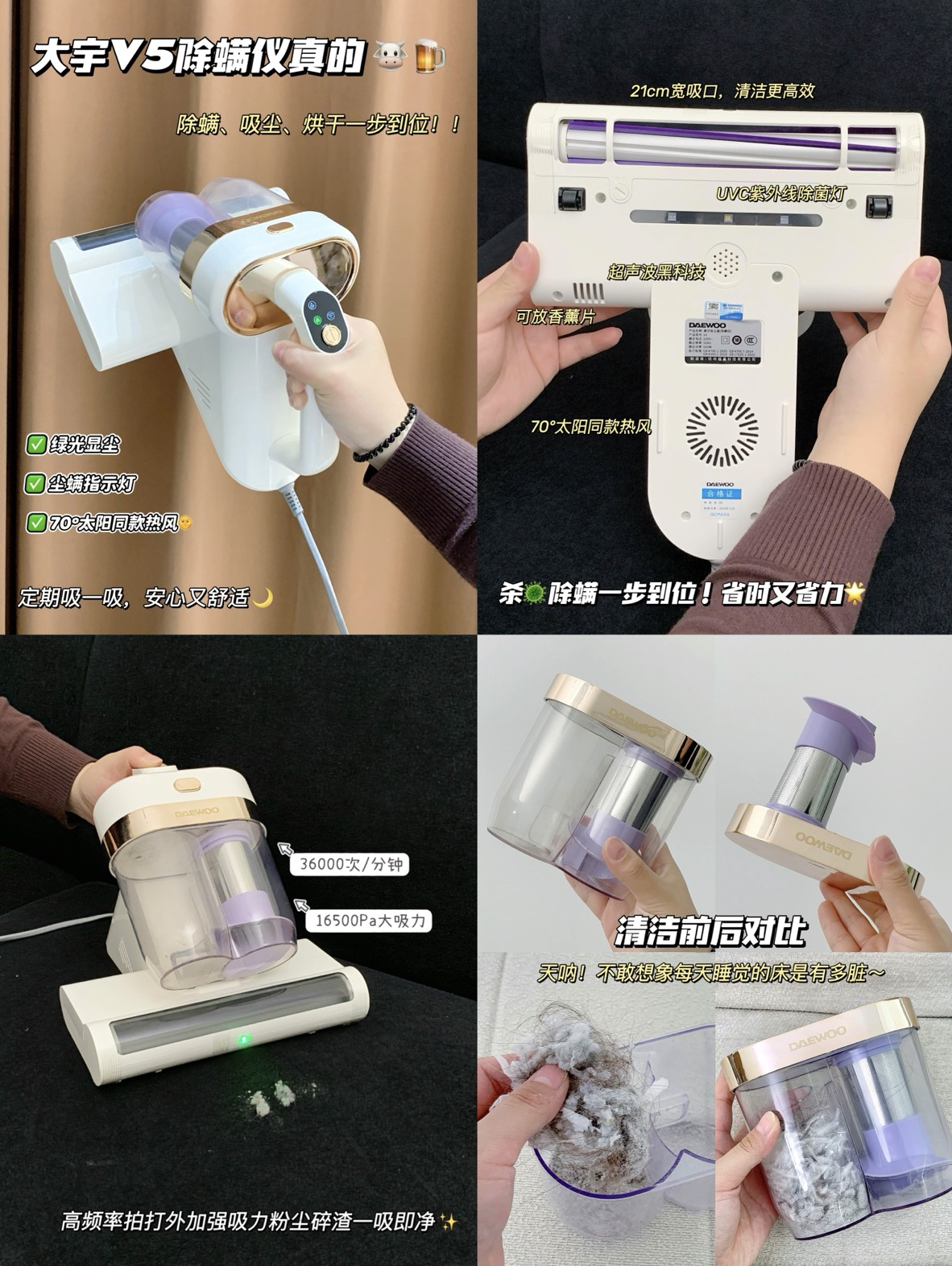 我家养猫🐱,其实我一直就想入手一个除螨仪。我觉得但凡家里有毛孩子的朋友应该都知道——你的床、你的沙发、你的地毯,甚至你帆布材质的包,毛儿根本清理不干净。我家有宠物专用吸尘器,还有各种手动除毛的工具,但我除毛的速度永远赶不上她俩掉毛的速度。大宇V5 除螨仪,你简直是我的救星!我第一次用它吸床垫,5 分钟不到,尘盒里就积了巨大一卷猫毛和灰尘皮屑……现在已经成为了我保持家内干净整洁的利器,推荐给大家!♥️♥️♥️