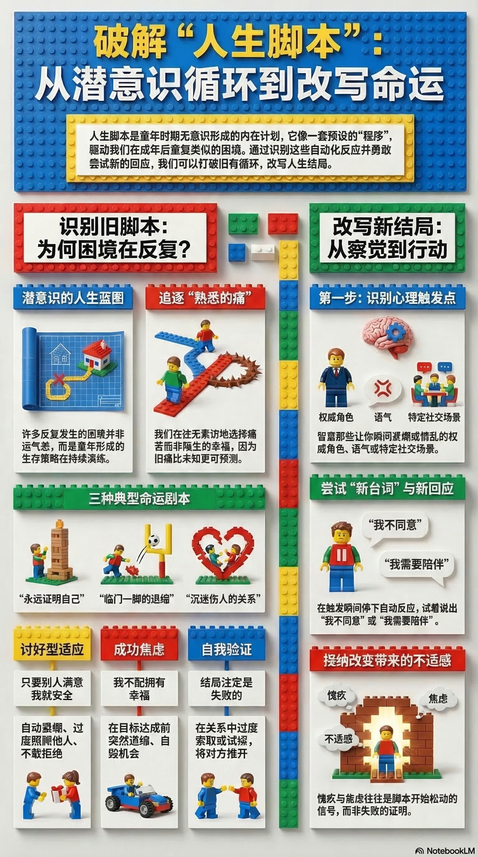 人生脚本:童年时期无意识形成的内在计划,持续影响成年后的选择、关系与命运感。