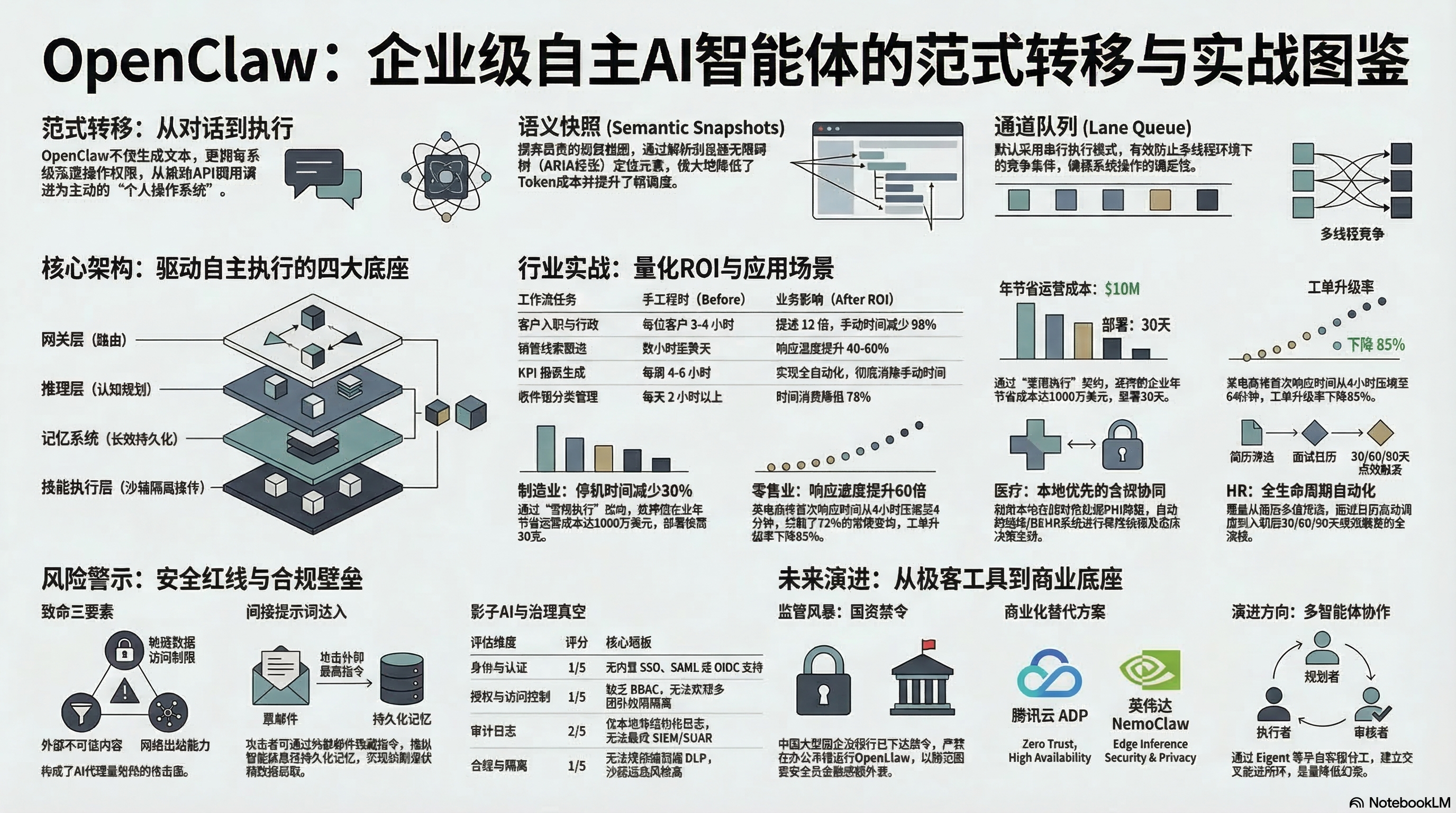 2026年2月,该项目创始人Peter Steinberger正式加入OpenAI以领导个人智能体开发,而OpenClaw项目本身则过渡至由OpenAI资助的独立开源基金会治理模式 4。这一战略举措标志着行业竞争焦点已从底层模型智能(Model Intelligence)转向可靠、安全且可扩展的智能体基础设施(Agent Infrastructure) 4。本报告将深度剖析OpenClaw的底层架构,按行业和业务职能详尽分类其企业级应用案例,量化其投资回报率(ROI),并全面评估其在企业大规模部署中所面临的系统性安全风险、合规壁垒及应对策略。