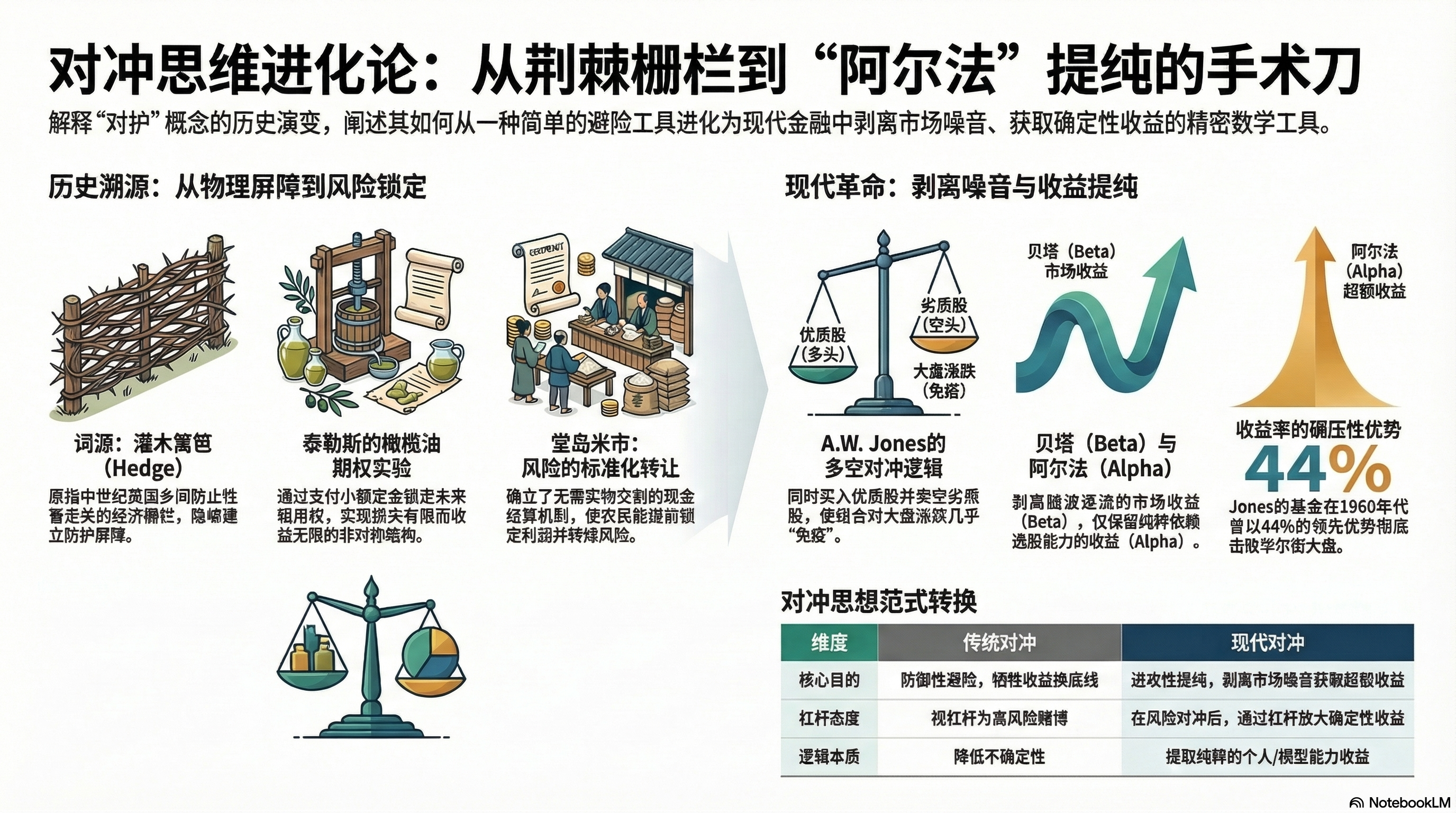 这段内容深入探讨了对冲思维从原始防御手段演进为现代金融利器的历史。作者从“对冲”一词源于中世纪灌木篱笆的物理隔离含义讲起,追溯至古希腊哲学家泰勒斯利用橄榄压榨机使用权创造的原始期权,以及日本德川幕府时期为化解米价波动而设立的堂岛米市期货制度。文章重点介绍了现代对冲基金之父琼斯如何通过多空仓位组合,利用数学手段将受大盘影响的贝塔风险剥离,从而提纯代表个人选股能力的阿尔法收益。这种演变标志着投资逻辑的根本变革,即将风险从一种避之不及的威胁转变为可以被精准手术刀拆解并量化的确定性工具。最后,文中指出对冲已超越简单的避险功能,成为一种利用杠杆和数学模型在市场噪音中获取非对称收益的先进思维范式。