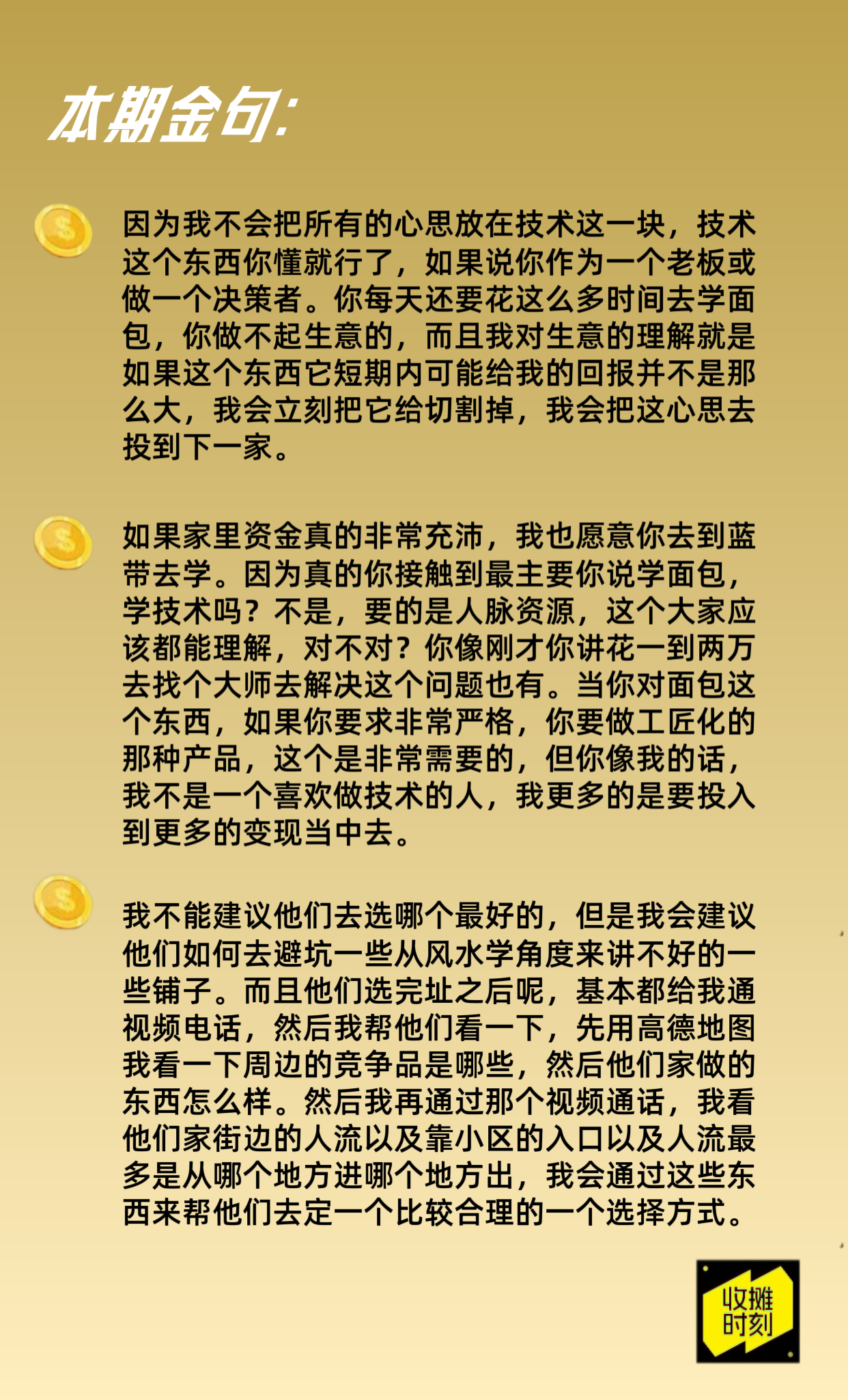 《收摊时刻》是一档主要围绕开店的搞钱经历复盘节目,钻研如何开源节流,优化盈利结构,吸取各行各业嘉宾的经验。每一个生意都需要在收摊以后进行反思,整理好状态再迎接新一天的营业。
