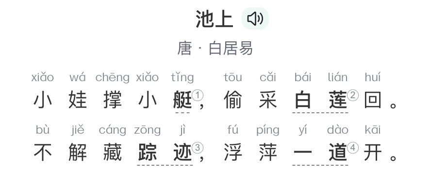 【释义-百度汉语】一个小娃撑着轻便的小船,偷偷采了白莲急着回来。(小娃)却不懂得藏好自己的行踪,船行水面,浮萍荡开,现出一条清晰的水道,一时合不拢。【感悟-百度汉语】诗中借小娃撑船偷采白莲,归来时不懂隐藏踪迹,船行处浮萍分开的情景,描绘了一幅充满童趣的采莲画面,体现了小娃天真幼稚、活泼淘气的可爱形象,营造出自然有趣的氛围,表达了诗人对儿童天真无邪的喜爱以及对田园生活的赞美之情。🎵【本期配乐】逃向春天