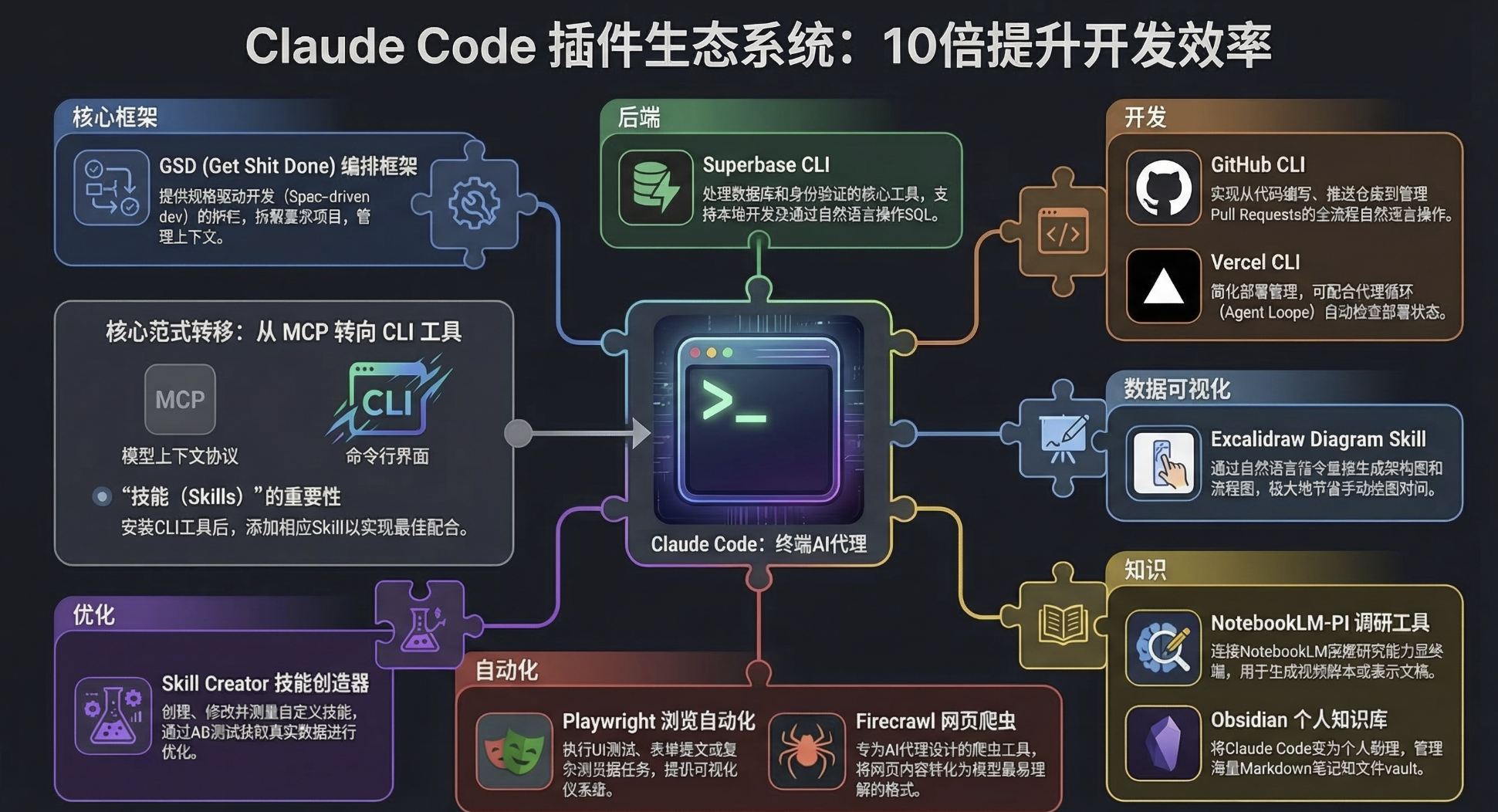 #插件类型一句话总结1Supabase CLICLI数据库 + 用户认证一站搞定2Skill CreatorSkill创建和量化评估自定义 Skill3GSD 框架框架从零建项目的规范化流程4NotebookLM CLICLI免费生成播客/视频/信息图等5Obsidian应用个人知识库 + AI 助理6Vercel CLICLI一键部署 + 自动监控7Playwright CLICLI浏览器自动化和 UI 测试8GitHub CLICLI终端内完成所有 Git 操作9Firecrawl CLICLIAI 优化的网页抓取10Excalidraw SkillSkill自然语言生成图表