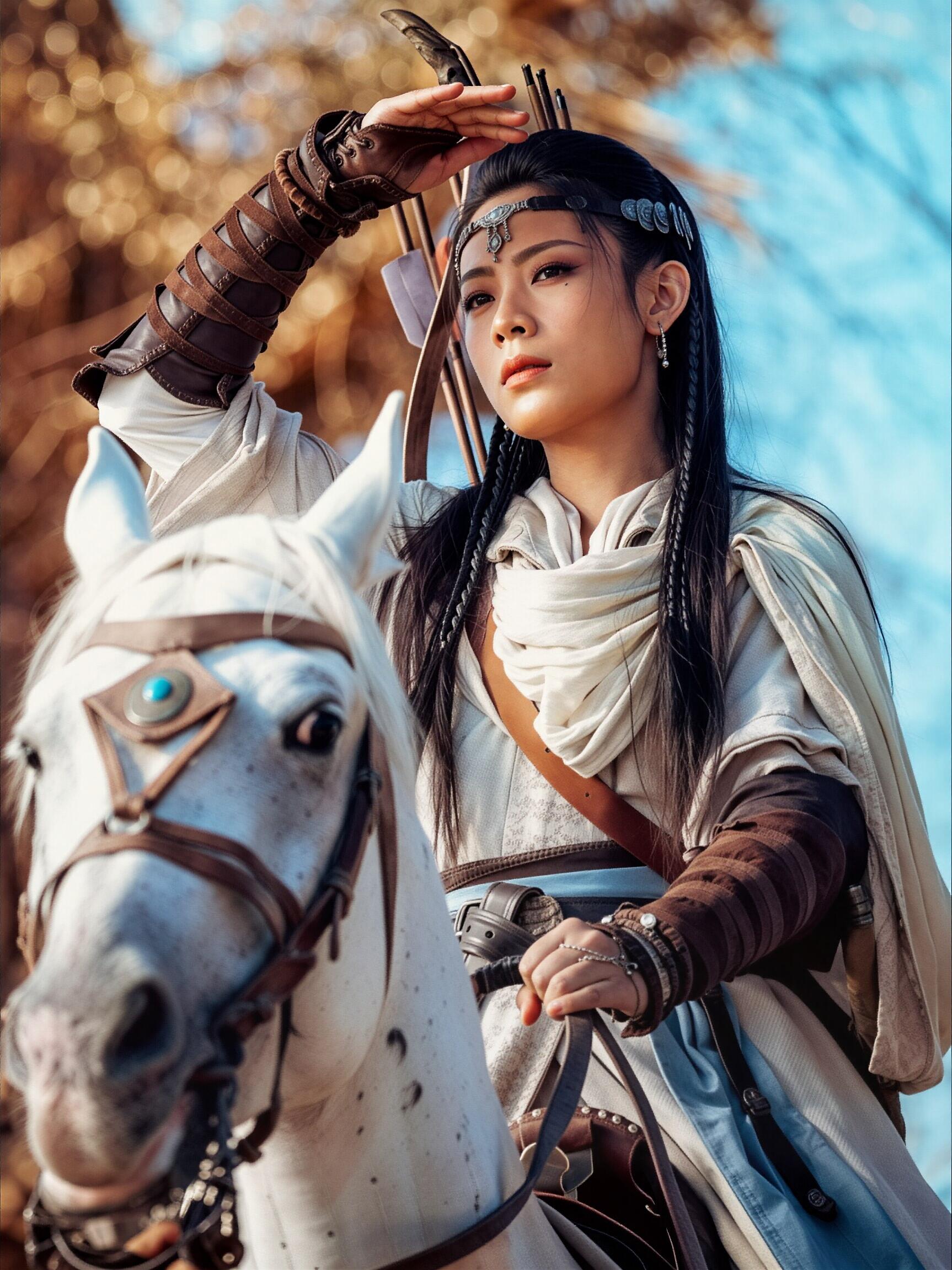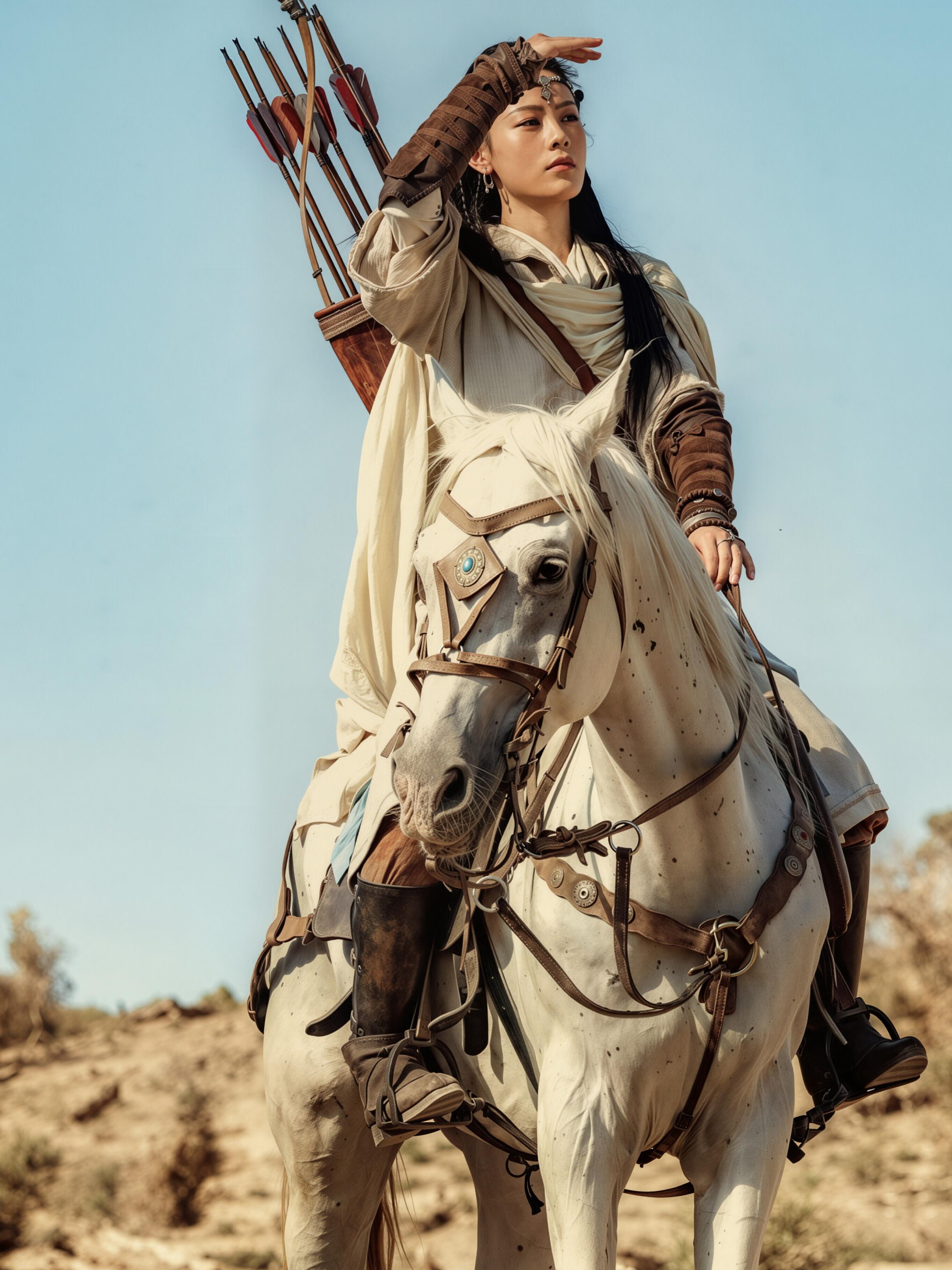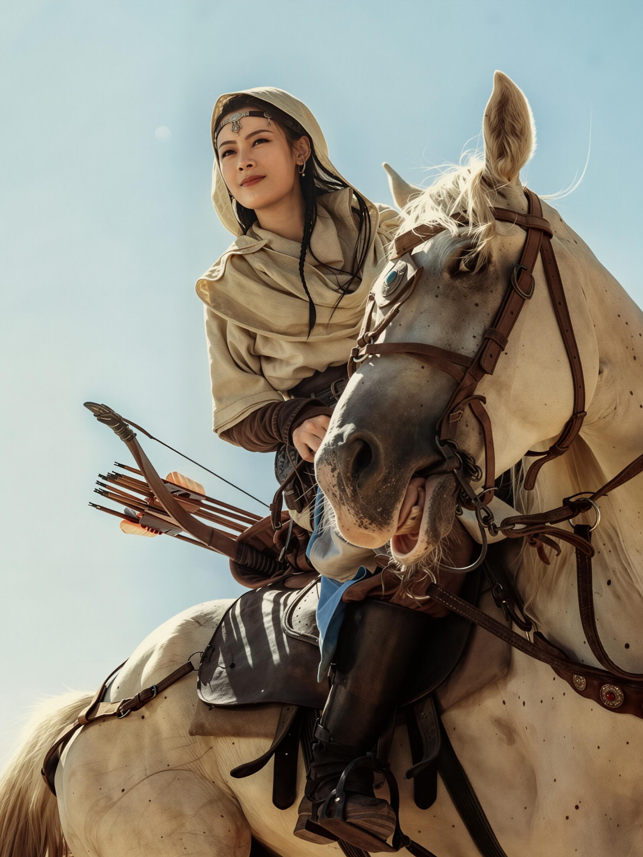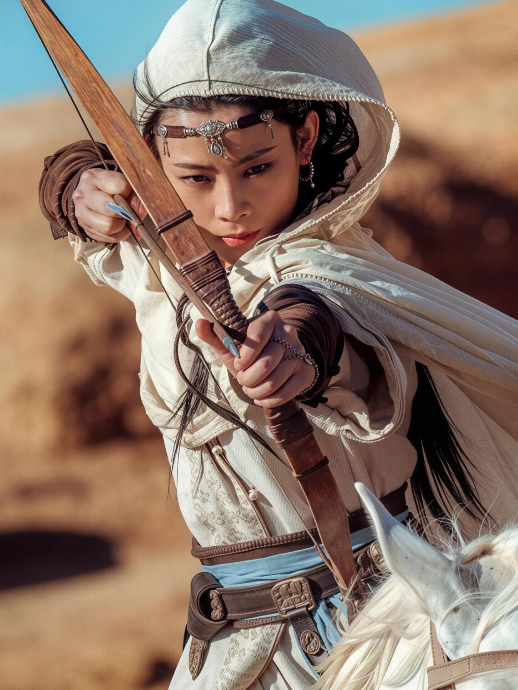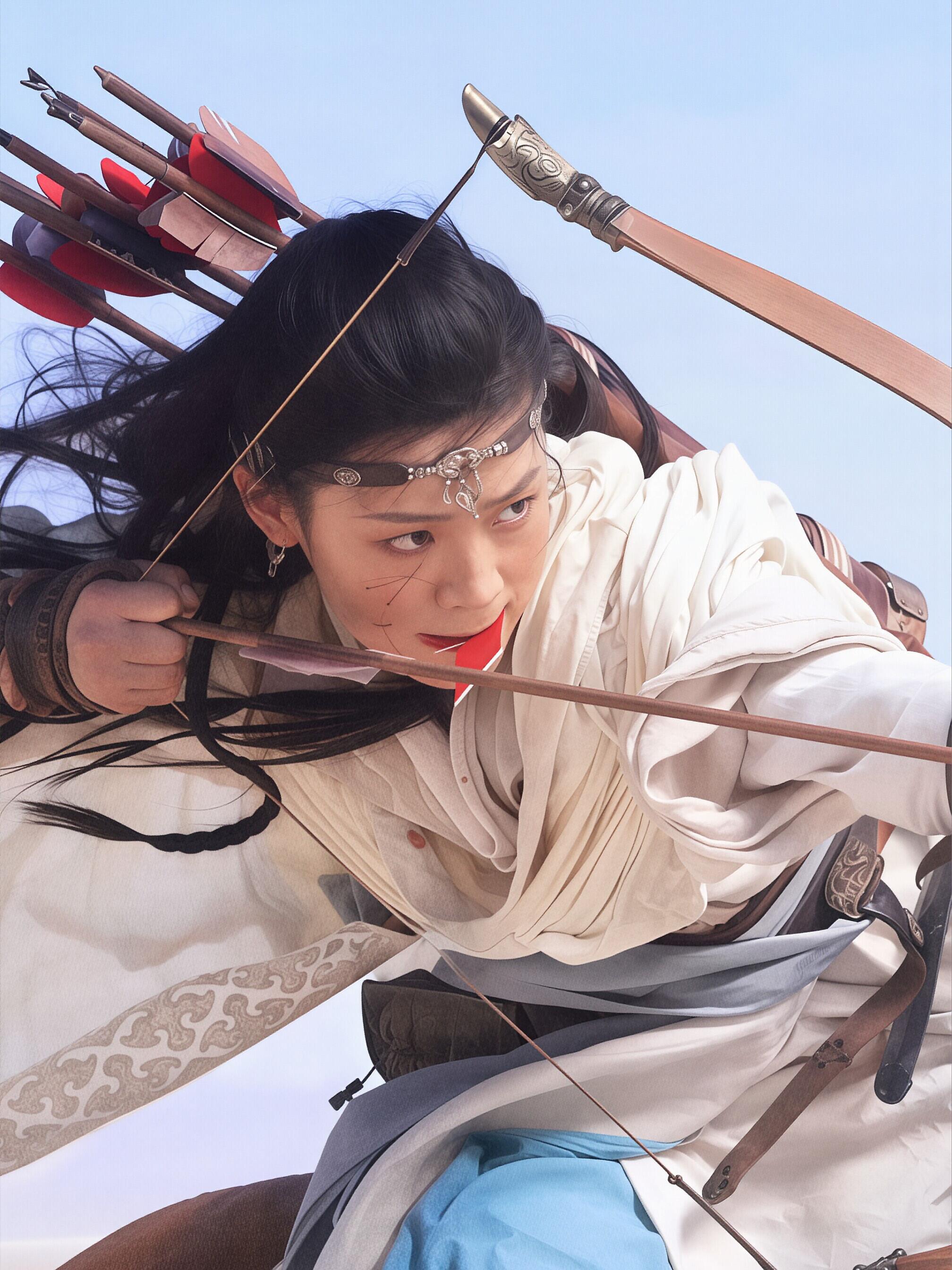二是特写抓情绪,放大狠劲与温柔:聚焦眼神、拉弓的手、脸颊的风沙。用大光圈虚化背景,特写要能传递情绪——眼神可以凌厉,也可以温柔,这就是侠女的双面性。