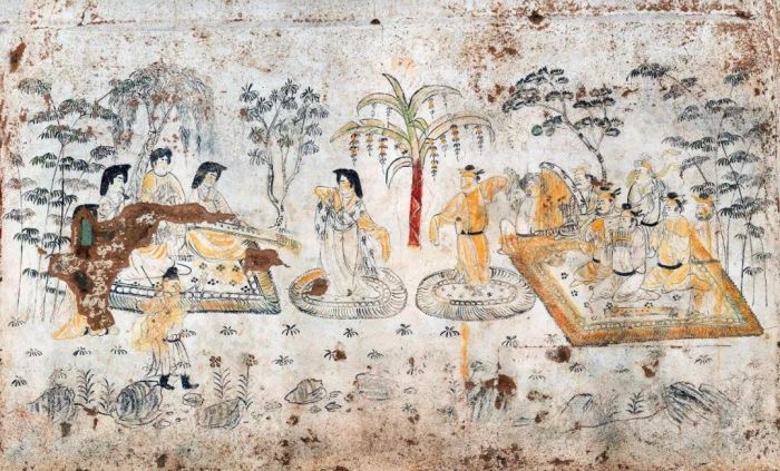 韩休墓《乐舞图》(唐原作,陕西历史博物馆):玄宗朝宰相墓壁画,胡汉乐队对舞,开元年间长安胡风实景。