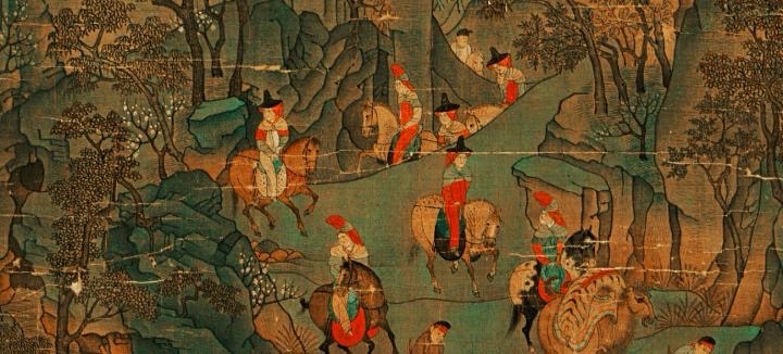 《明皇幸蜀图》(传李昭道,唐):台北故宫博物院藏。描绘756年玄宗因安史之乱弃长安奔蜀的场景,以金碧青绿山水包装,弱化了逃难的狼狈。