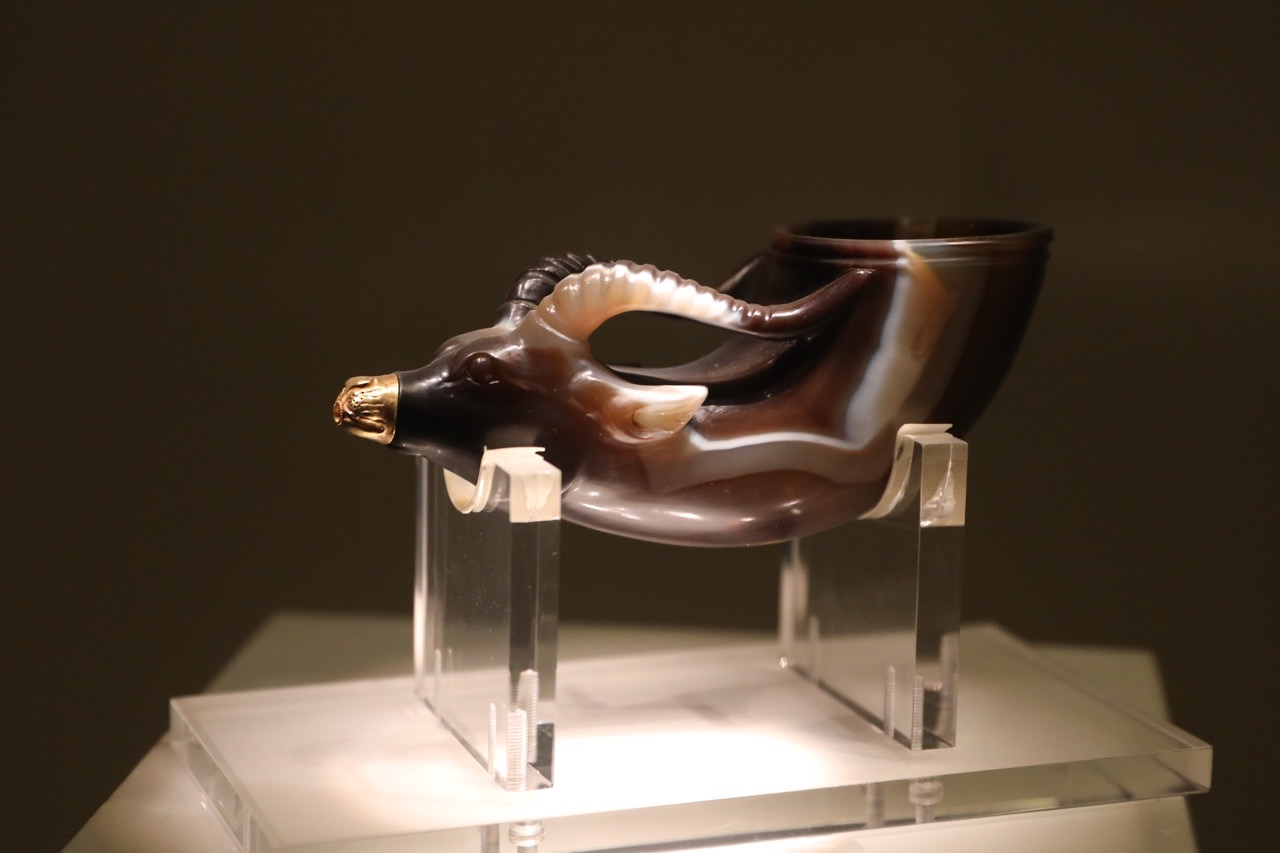 镶金兽首玛瑙杯(何家村窖藏,陕西历史博物馆):来自中亚的玛瑙,唐代西域交流的实证,玄宗年间宫廷用器。