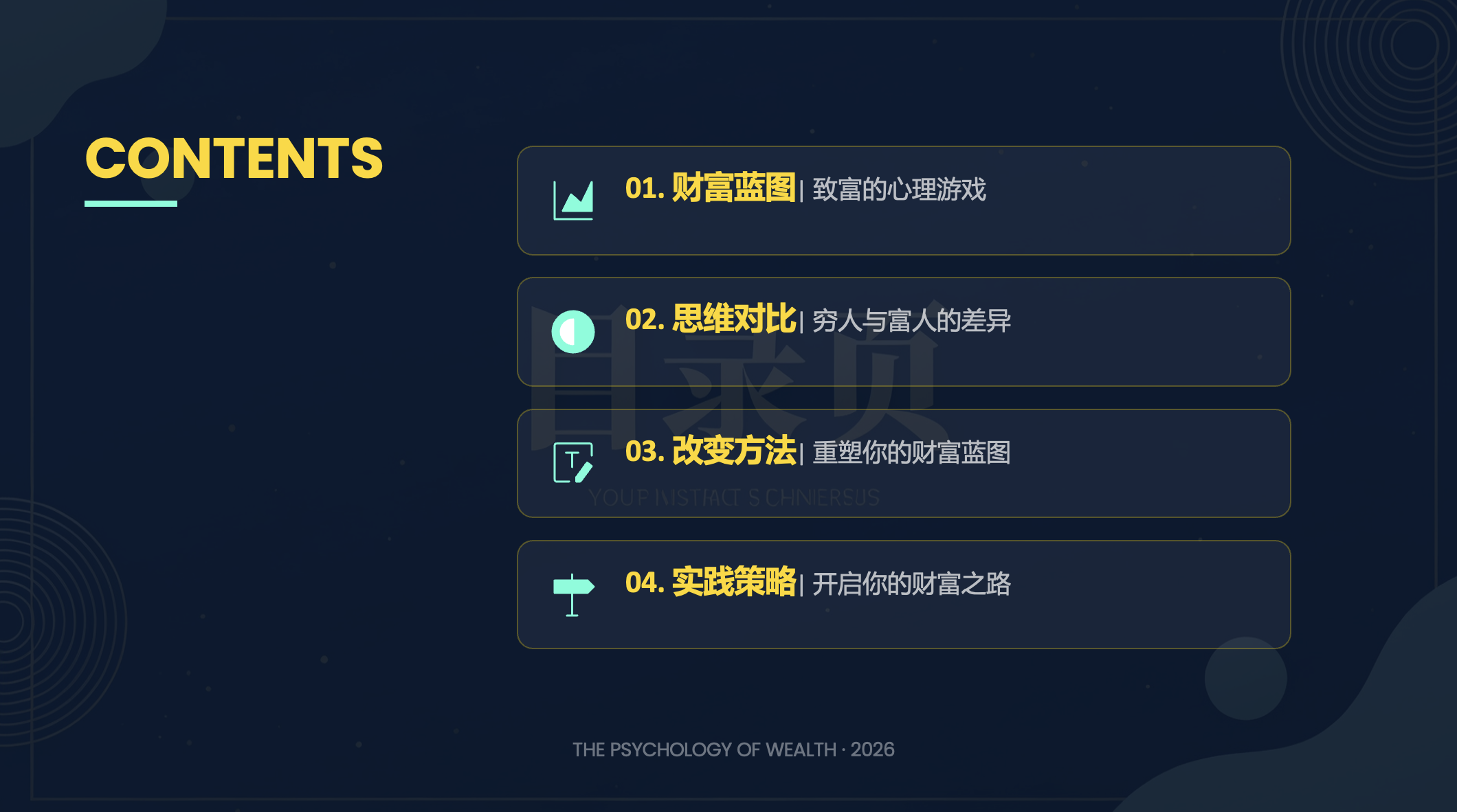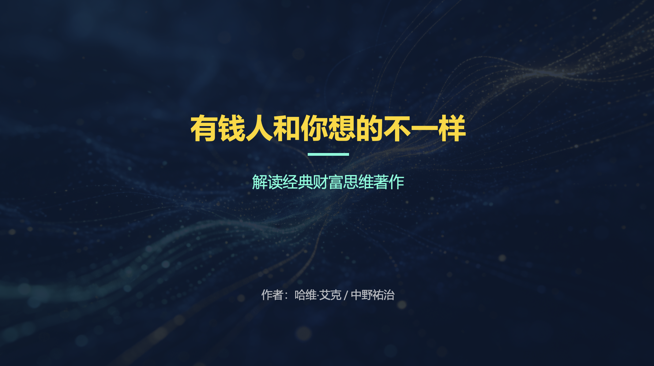 大家好,今天我将和大家一起解读一本经典的财富思维著作——《有钱人和你想的不一样》。这本书揭示了财富背后的核心秘密,那就是我们的思维方式。希望通过这次分享,能帮助大家重新审视自己的财富观念,开启通往财富自由的大门。本次分享将分为四个部分。首先,我们会探讨“财富蓝图”这个核心概念,了解它如何决定我们的财富水平。接着,我们会对比穷人和富人在思维方式上的关键差异。然后,我们将学习如何通过具体方法来重塑自己的财富蓝图。最后,我们会分享一些实用的实践策略,帮助大家将所学应用到实际生活中。