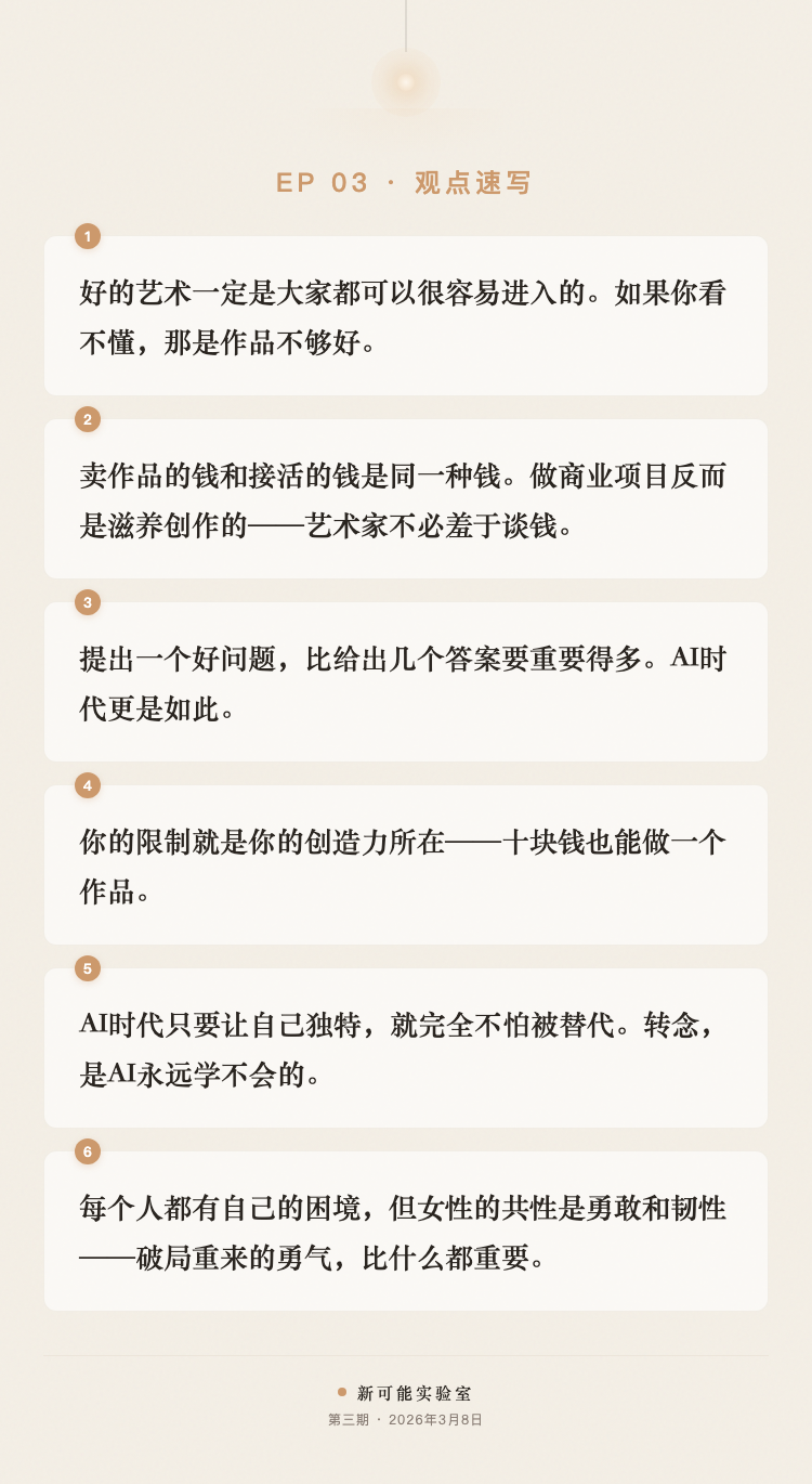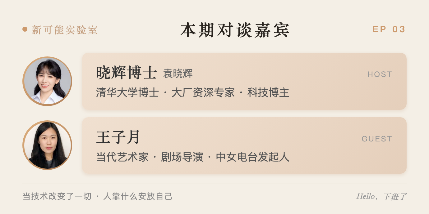 这是新可能实验室的第三期节目,三八国际妇女节当天直播。我邀请到了王子月——一位当代艺术家、剧场导演、"中女电台"发起人。说实话,我的朋友中艺术家身份的人并不多。我是理工科背景,长期沉浸在AI和科技的世界里。但越用AI,我越觉得"自己本身是谁"这个问题更重要了——当效率都可以被工具解决的时候,你为什么要做这件事情?