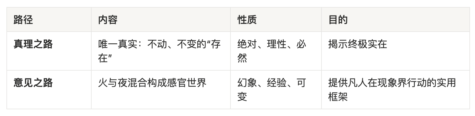 重要澄清:巴门尼德并未否定“意见之路”的实用性,但明确其非真——它是一种“有结构的虚构”。