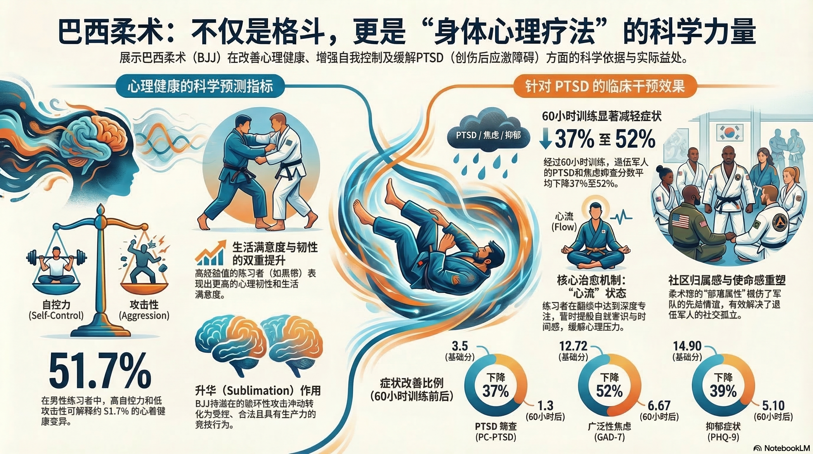- PTSD 的辅助疗法:针对退伍军人和急救人员的研究,详细说明 BJJ 如何通过提供社交支持(战友谊)、结构化的训练规则以及“心流”(Flow)体验,有效缓解创伤后应激障碍(PTSD)的症状。