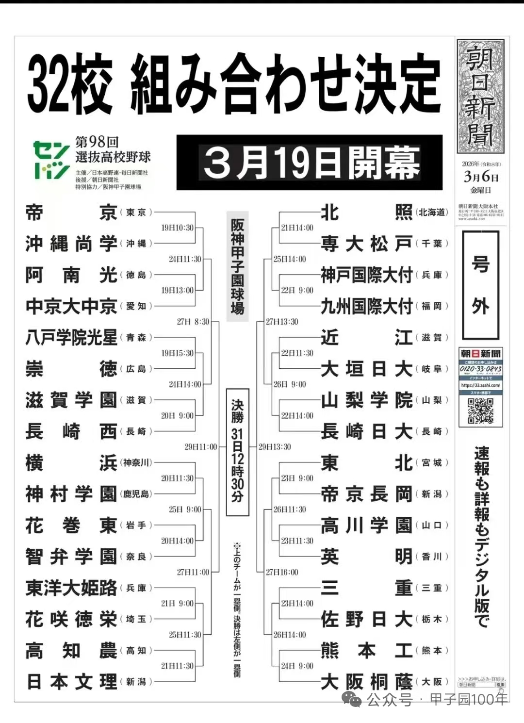 2026春季甲子园(第98届选拔高校棒球大会)即将于3月19日开幕,预计3月31日闭幕。结合3月6日首轮对战抽选结果,盘点本届出场校和对战组合看点。同时分享一些春甲子园的历史小知识。更多春季甲子园和日本高校棒球信息,欢迎关注同名微信公众号。